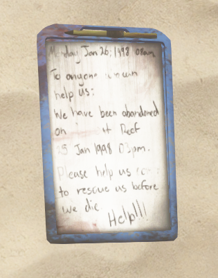 "Monday Jan 26, 1998 8 a.m. To anyone who can help us: we have been abandoned on Agincourt Reef by MV Outer Edge, Jan 25, 1998. 3 pm. Please help us, come to rescue us before we die. Help!!!"