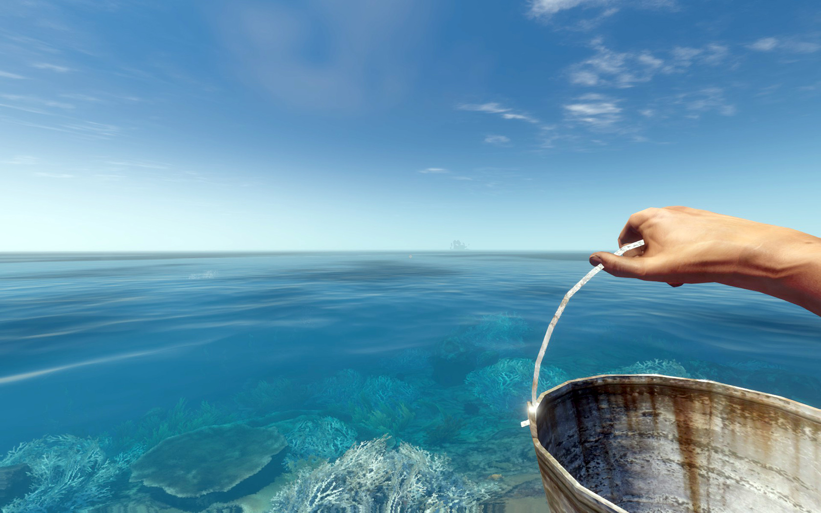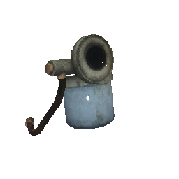Zweck: Der Metallkübel lässt sich am Lagerfeuer mit Grube und Spieß aufhängen um Salzwasser auszukochen. Linke Maustaste bei oder an Wasser füllt ihn mit Wasser, wobei der Transport mit Vorsicht zu genießen ist.