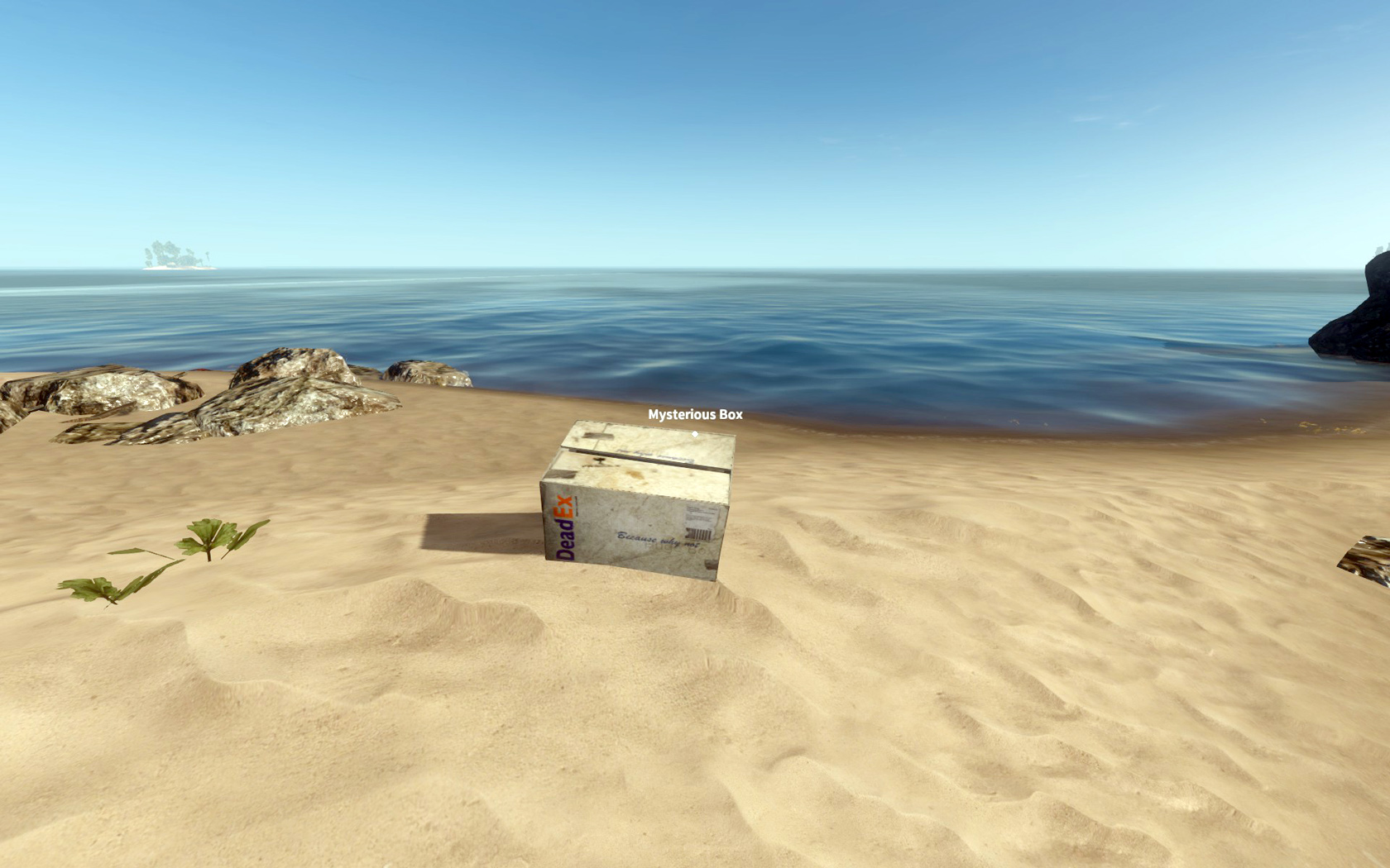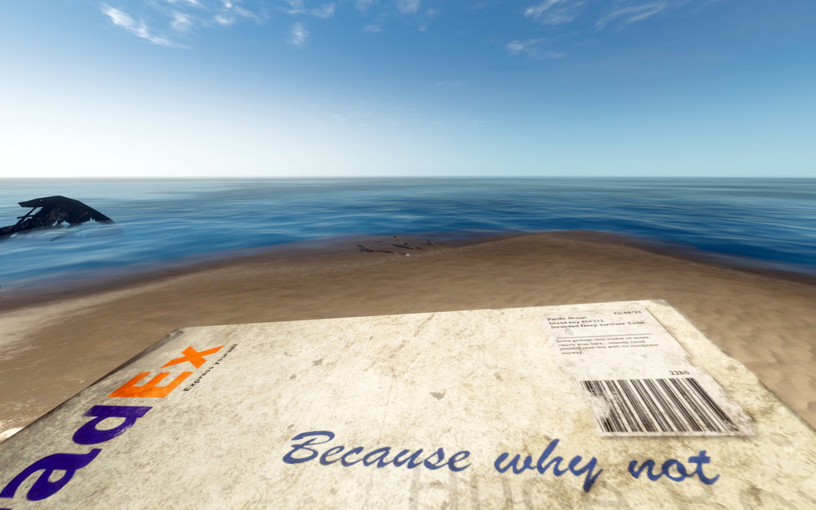 Information: Eine Homage an die FedEx-Kartons aus dem Film "Cast Away - Verschollen". Kann aufgehoben und abgelegt werden, scheint im Inventar auf, non-interaktiv