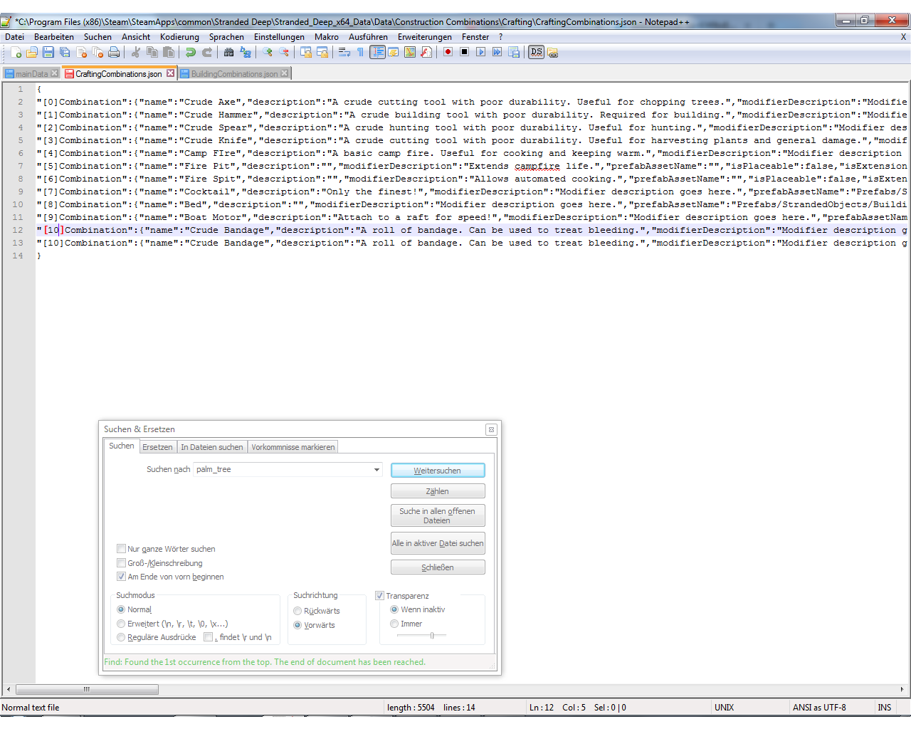 Anschließend öffnen wir die CraftingCombinations.json mit Notepad++,