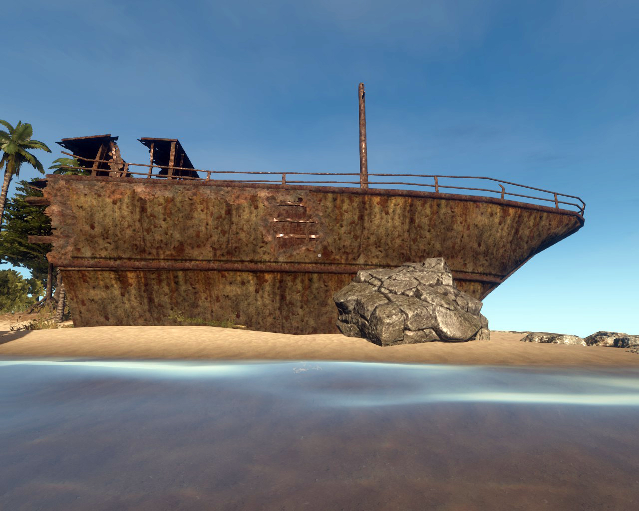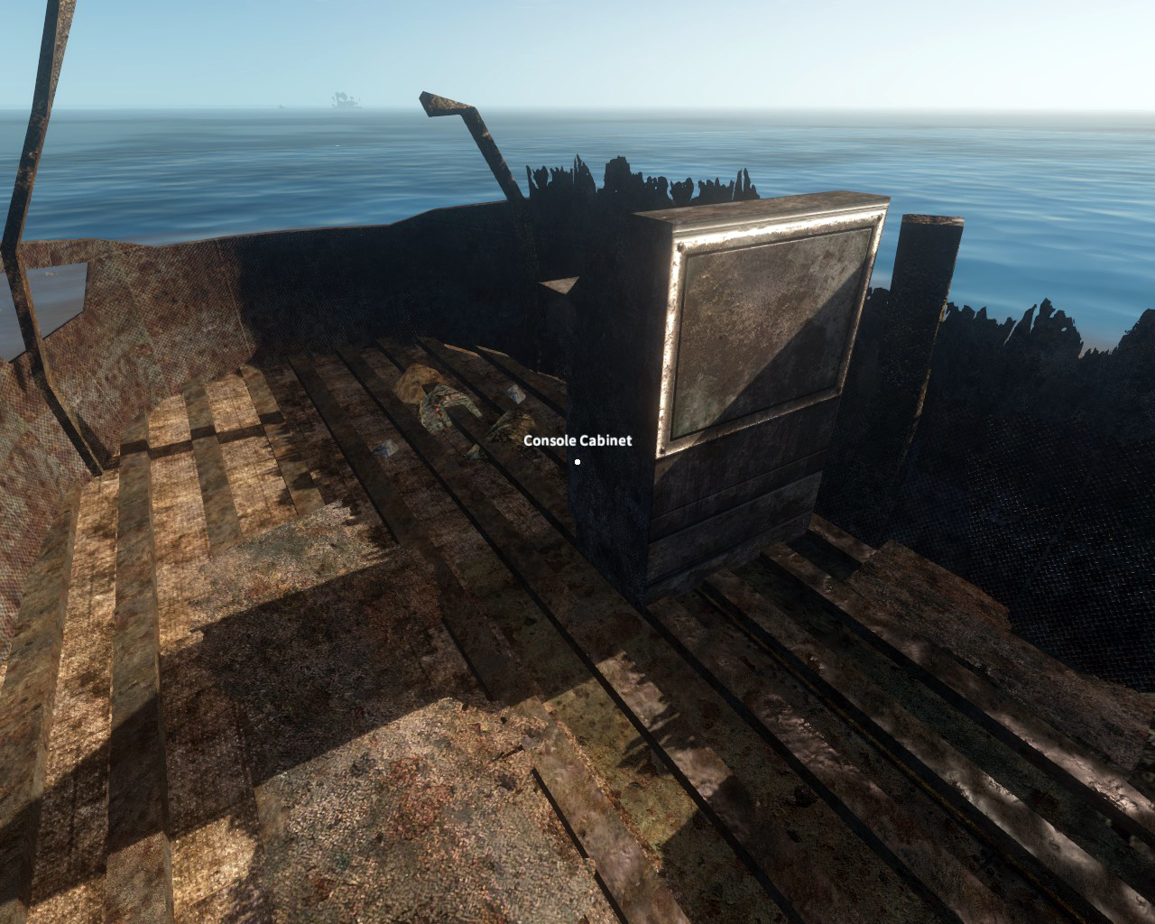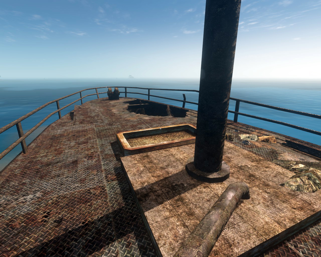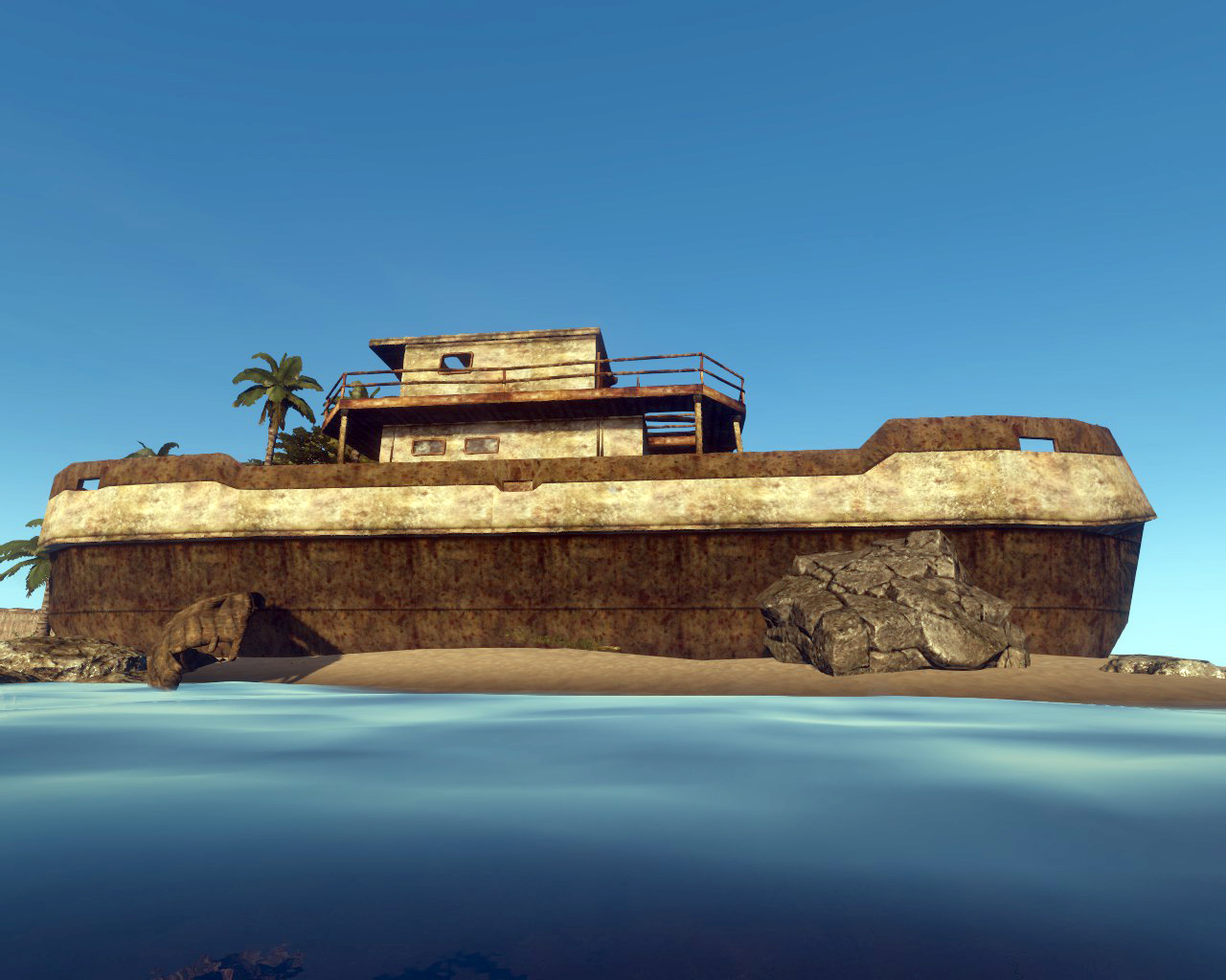 Das Momentan größte Wrack im Spiel. Unterdecks sind nicht betretbar. Ganz oben auf dem Oberdeck, befindet sich der Kontrollraum oder auch Brücke genannt, dieser ist durch eine Tür in Richtung Bug zu betreten (Bild 1 und 2). Unter dem Kontrollraum befindet sich eine Mannschaftskajüte. Diese ist durch eine Tür auf der Backbordseite des Schiffes betretbar,die Tür in Richtung Heck funtioniert nicht (Bild 1 und 3).