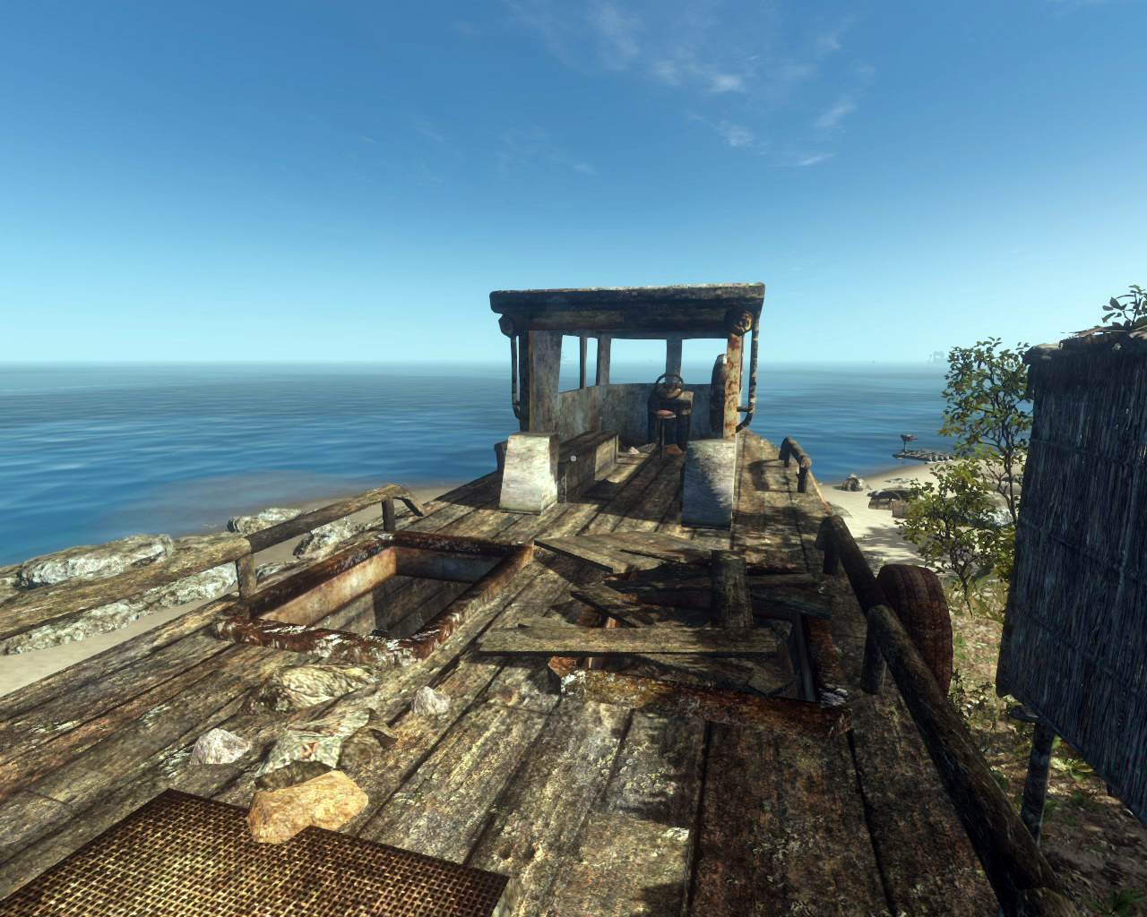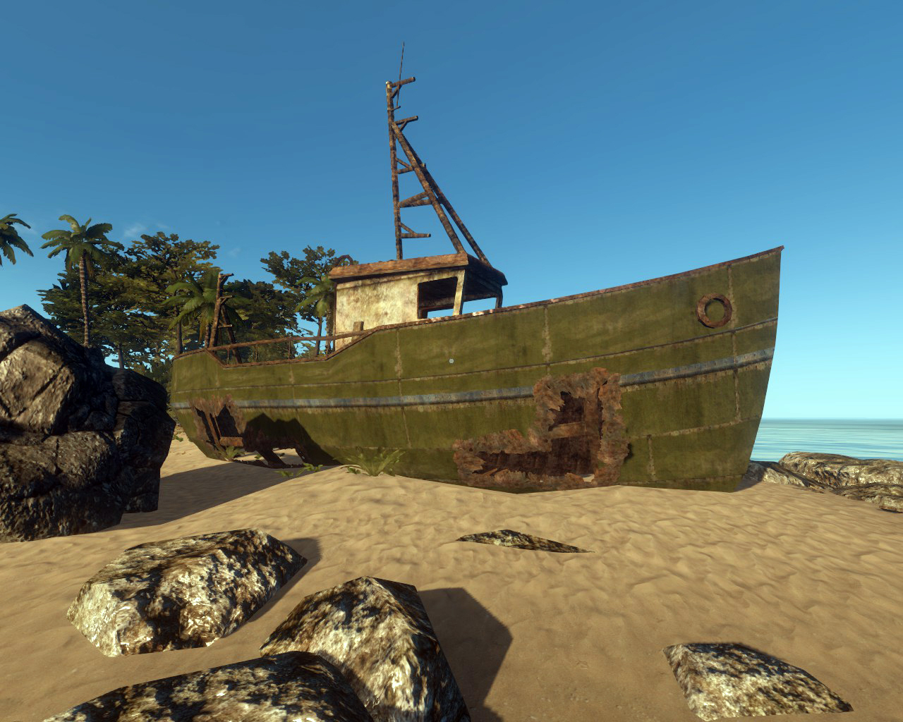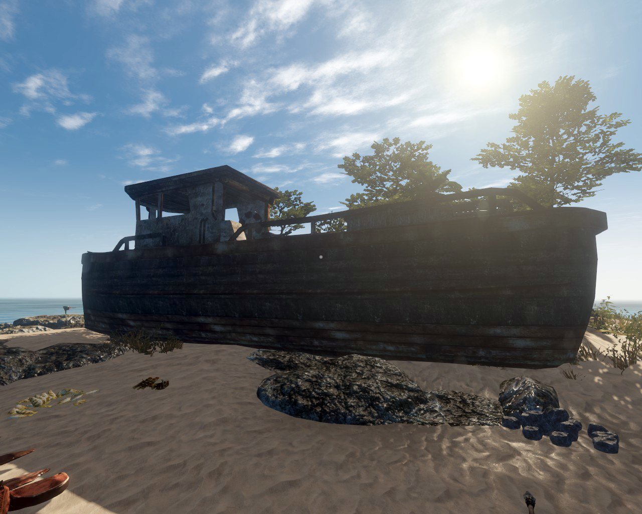 Das Momentan größte Wrack im Spiel. Unterdecks sind nicht betretbar. Ganz oben auf dem Oberdeck, befindet sich der Kontrollraum oder auch Brücke genannt, dieser ist durch eine Tür in Richtung Bug zu betreten (Bild 1 und 2). Unter dem Kontrollraum befindet sich eine Mannschaftskajüte. Diese ist durch eine Tür auf der Backbordseite des Schiffes betretbar,die Tür in Richtung Heck funtioniert nicht (Bild 1 und 3).
