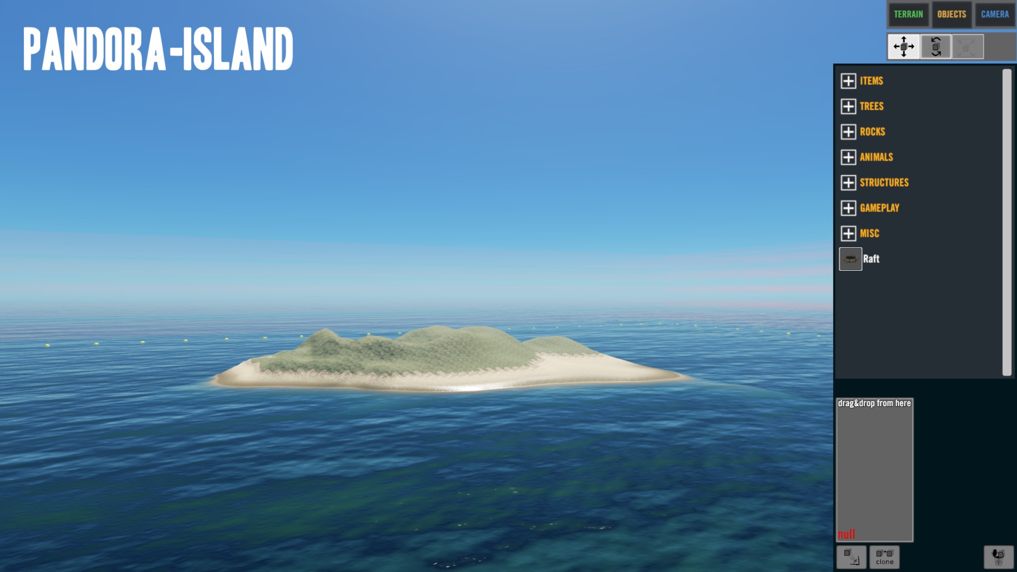 Alles was ich in der ersten Version als Cliffs, Rocks, Trees auf der Insel platziert hatte, war im Spiel auf der Insel vorhanden