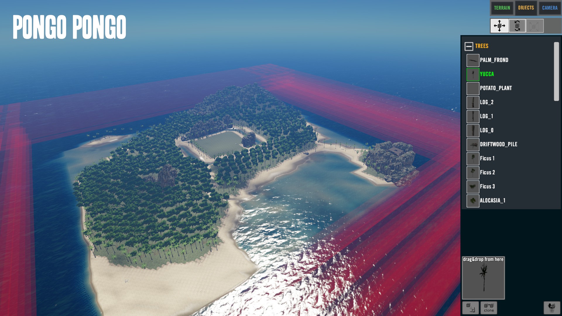 Verringert man aber die Distanz auf ein Tile, sieht man an den Konturen ganz deutlich die Modellierte Form der Heightmap. Ich erkenne meine Insel auch aus der Distanz.