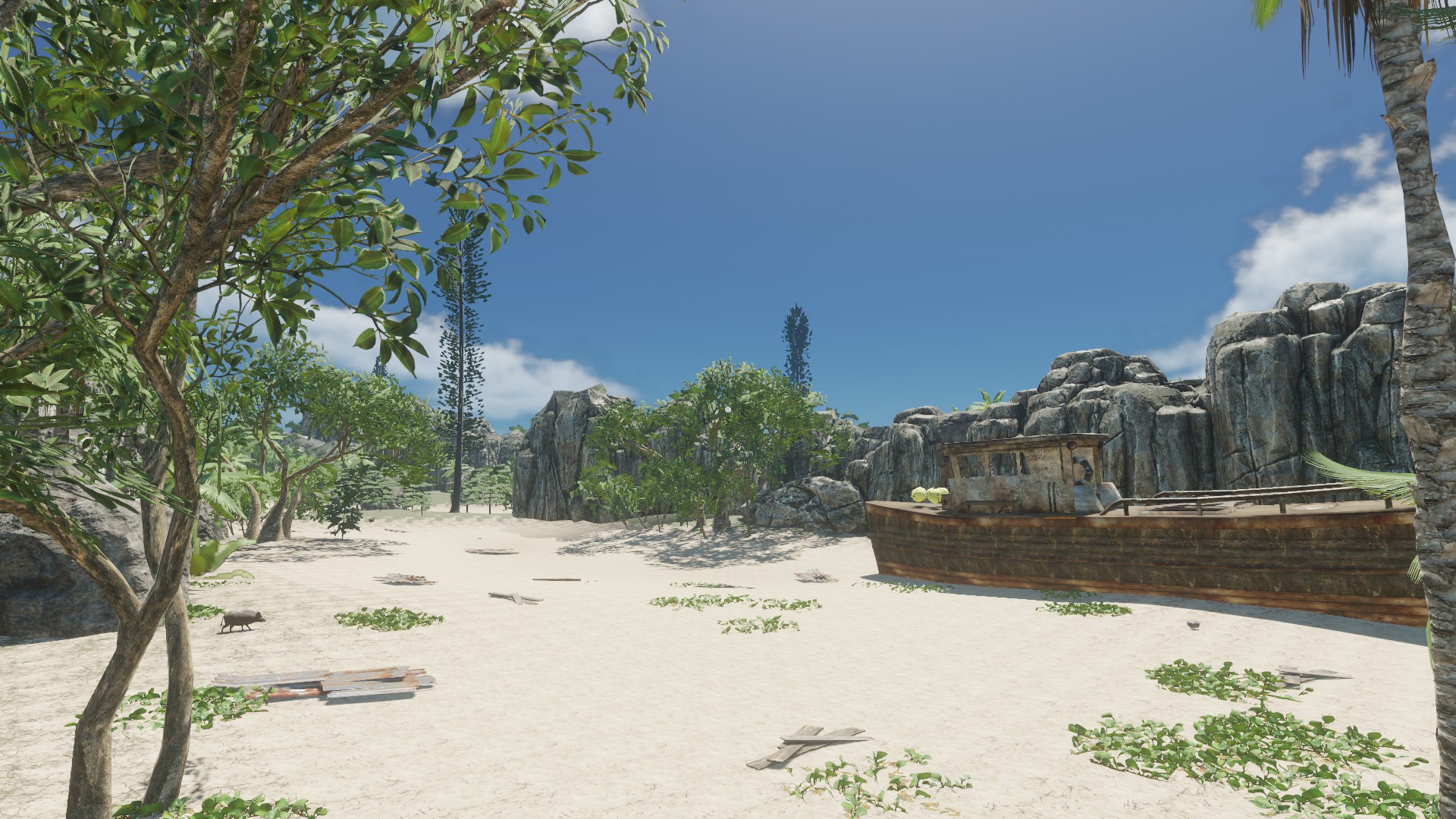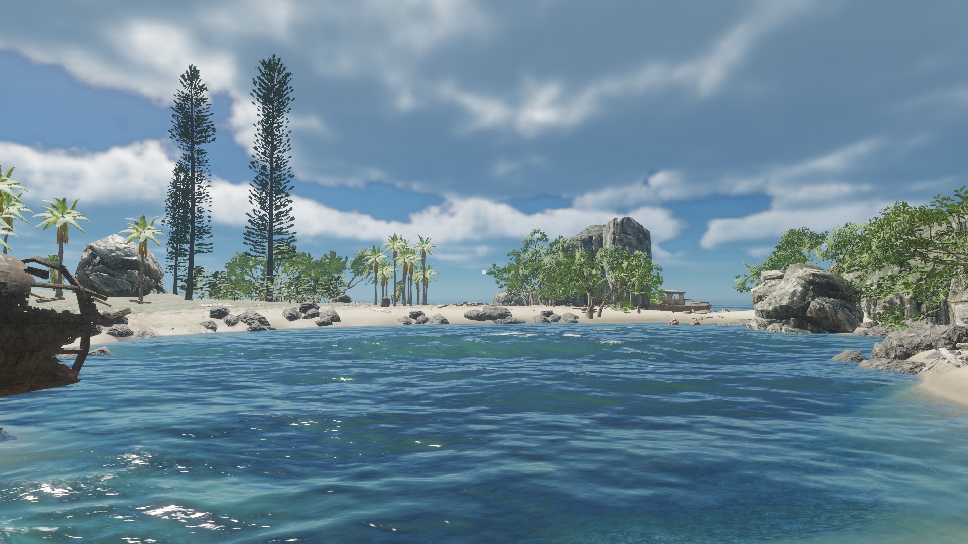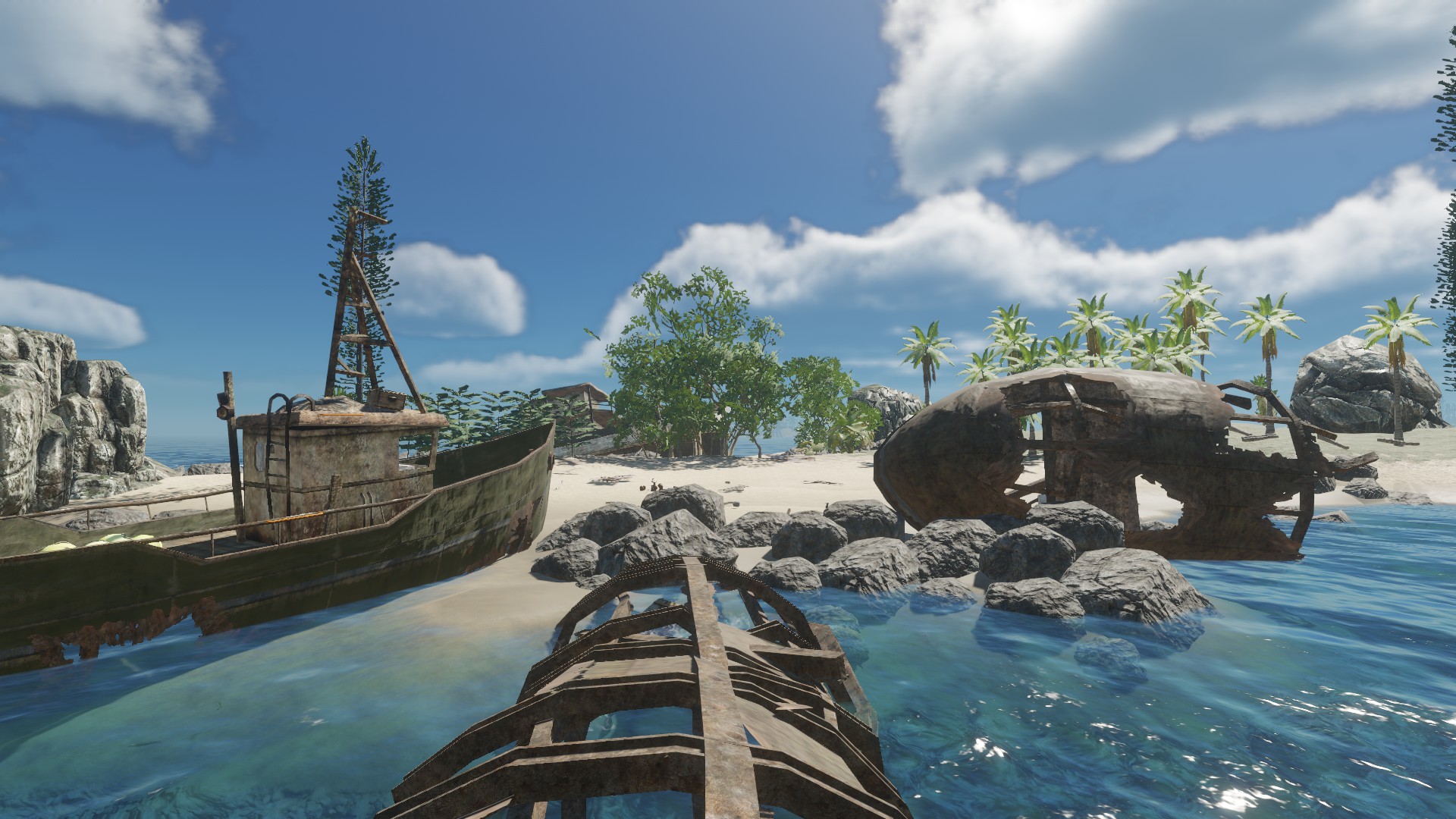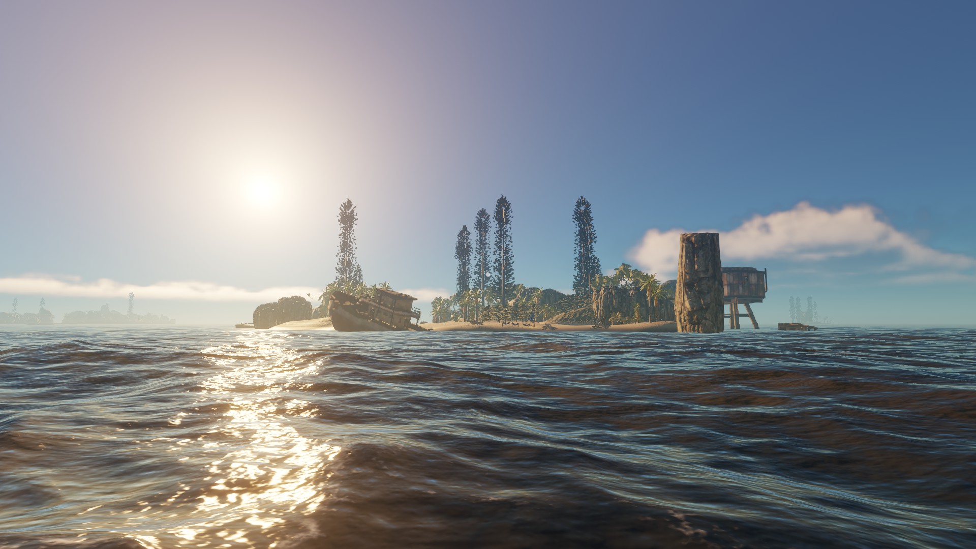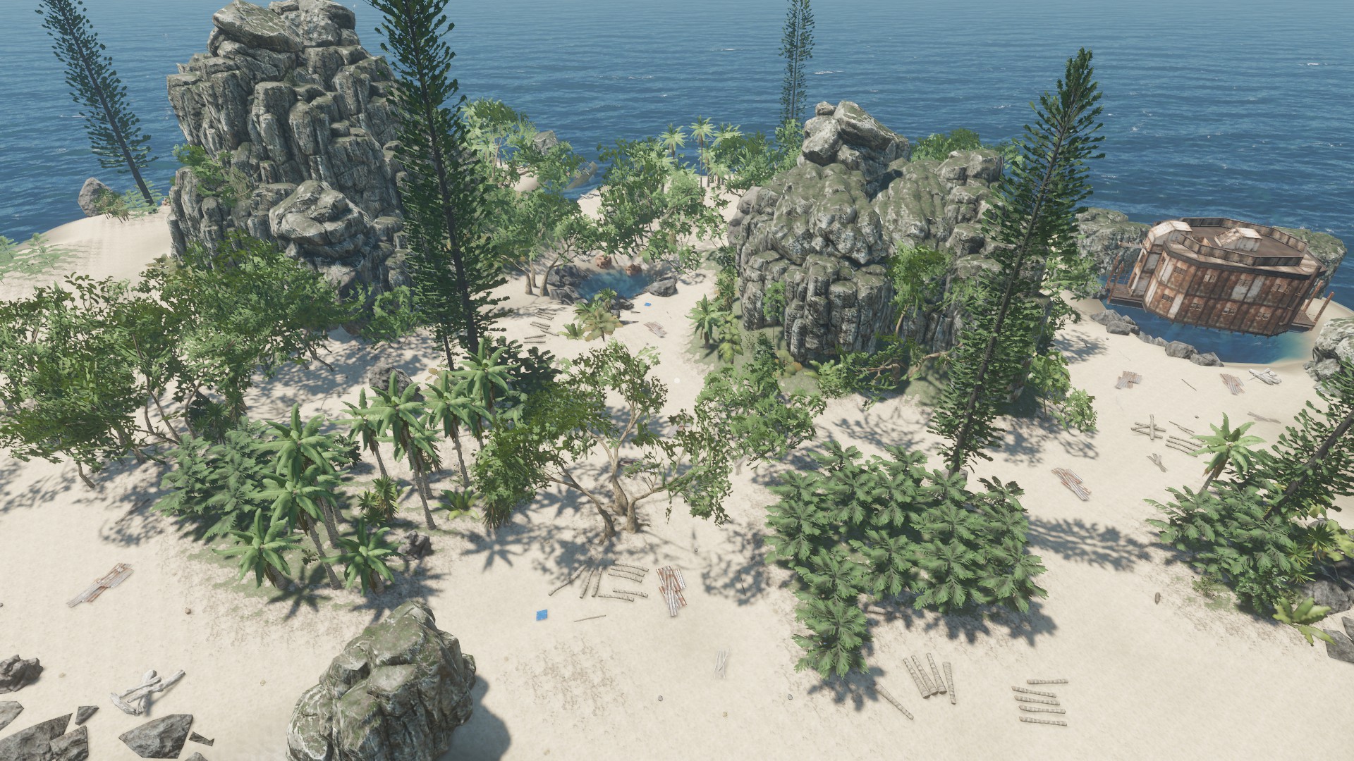 Das Schiffswrack was ihr auf dem Bild seht, ist eine Insel so zu sagen - ich fand diese statische Aufteilung der Inseln ziemlich öde - auch das jede Insel "viele" Rohstoffe hat und gut zum wohnen ist. In meiner Inselwelt ist es etwas schwieriger und es kann passieren, dass man auf eine Insel kommt und außer einer Krabbe und 3 Palmen nichts vorfindet - zumindest über Wasser ;)