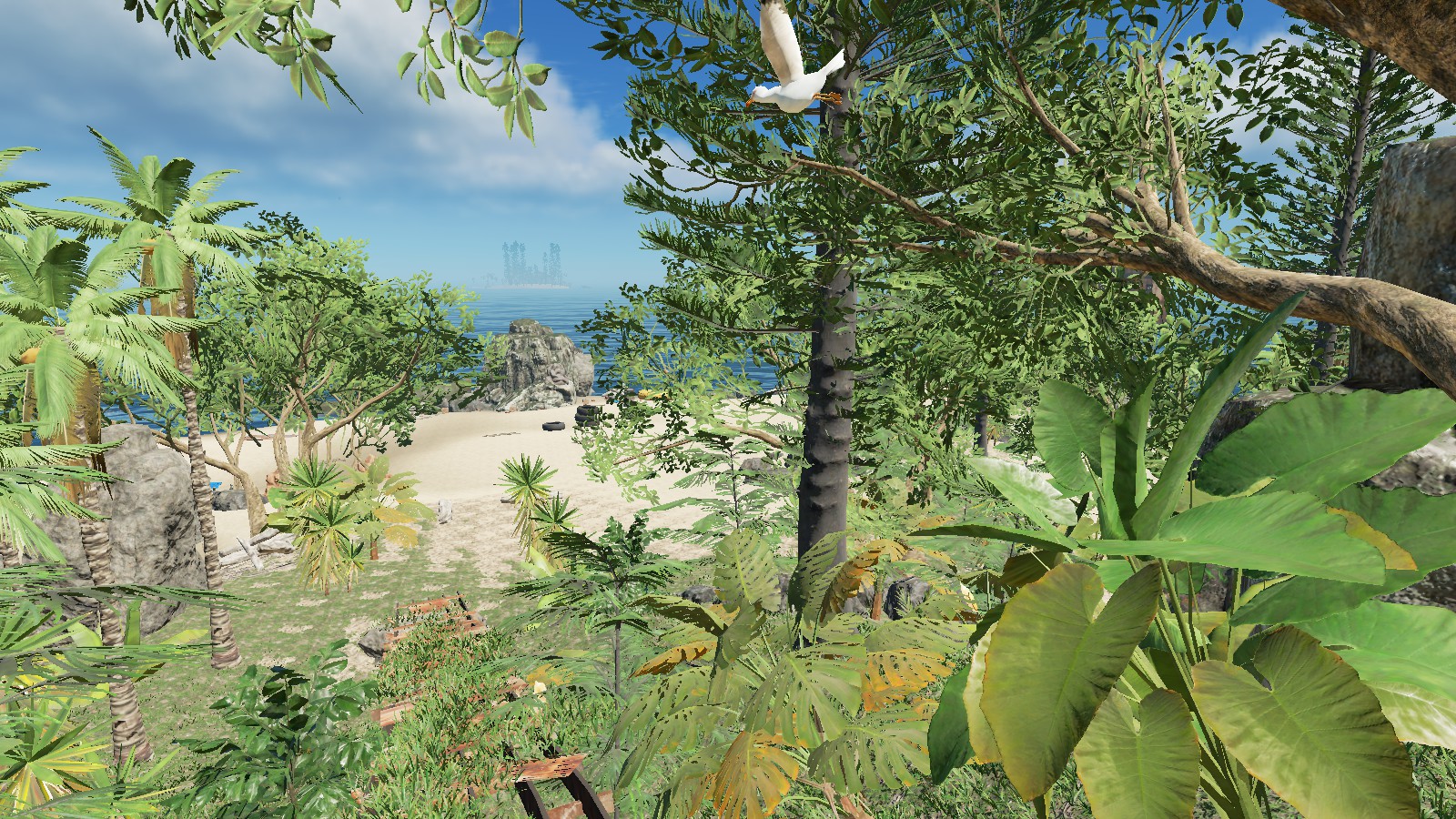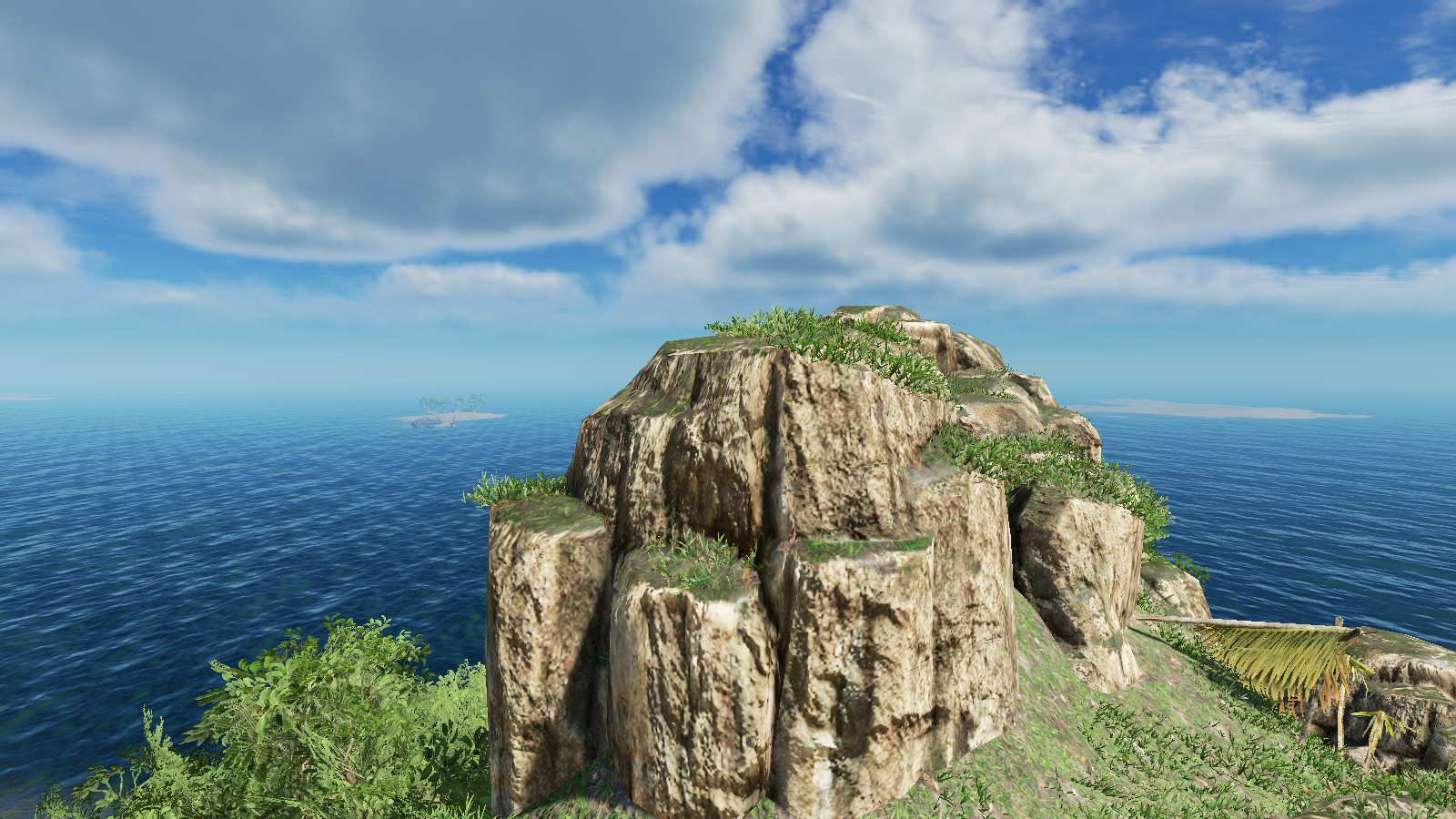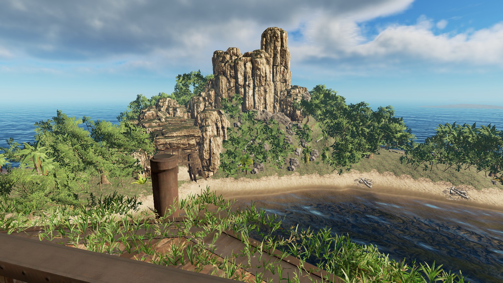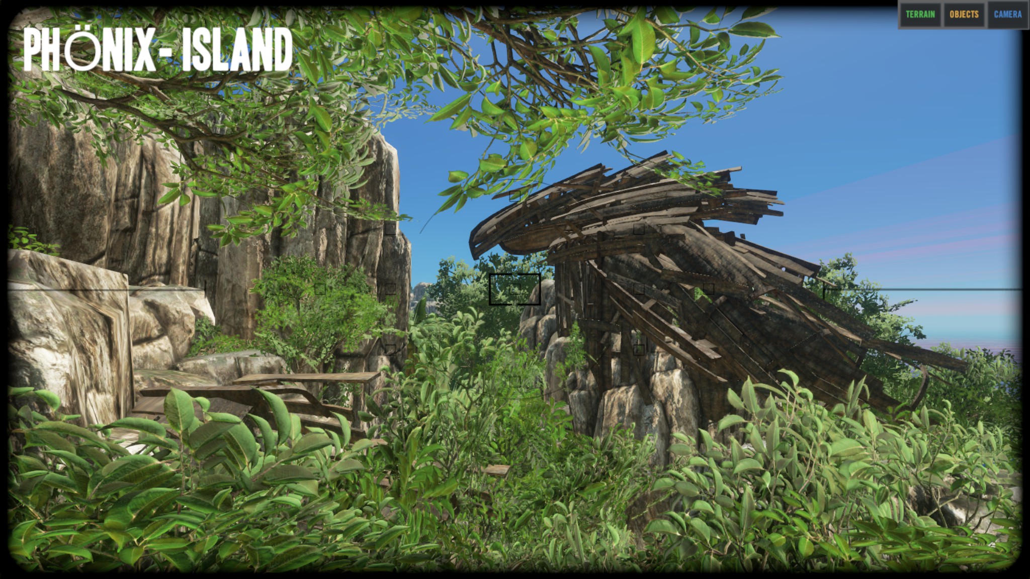 Auf Deutsch:"Ich denke, die Insel ist wirklich nett, wie es ist und ich habe nichts von der Vegetation oder Rock / Klippen entfernt." Die einzigen Dinge, die ich entfernt habe, waren die Stämme, Palmenwedel, Felsen, Stöcke und Bleche. Ein paar habe ich zurückgebracht als Start-Ressourcen, aber Spieler können mehr von der Vegitation und Bergbau Zeug bekommen. " Zitat Ende