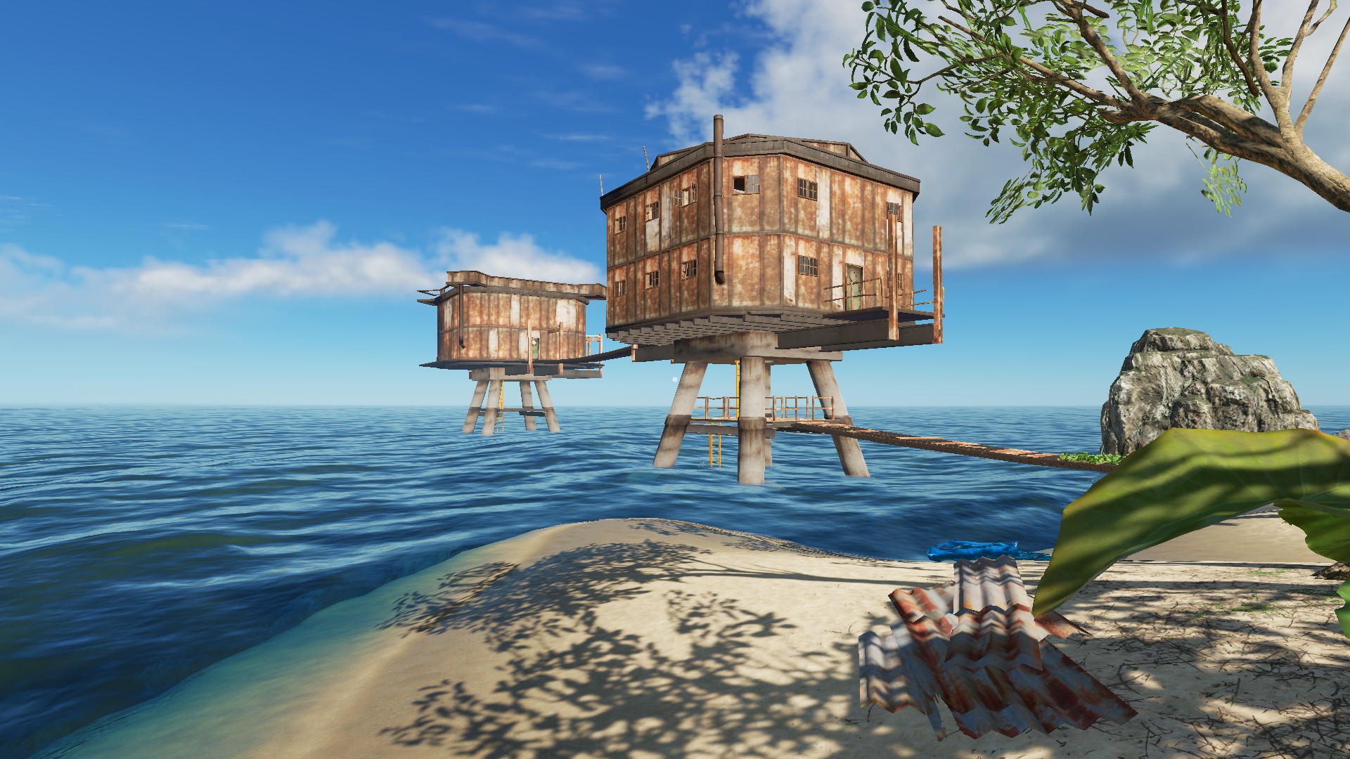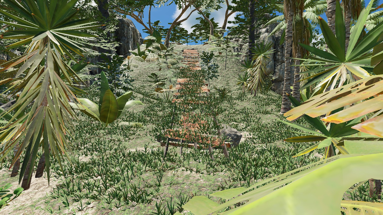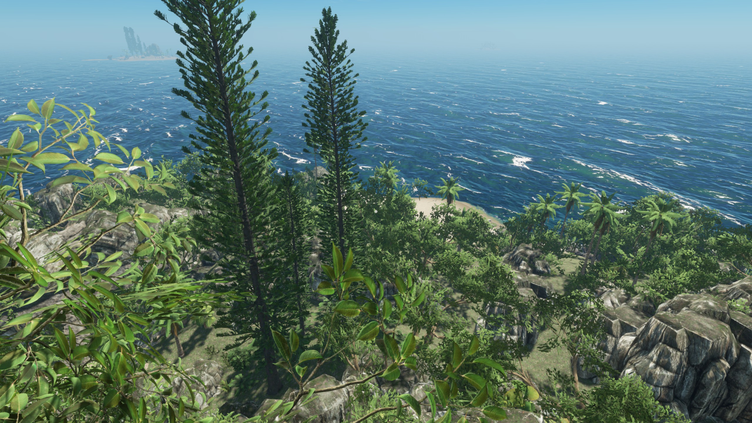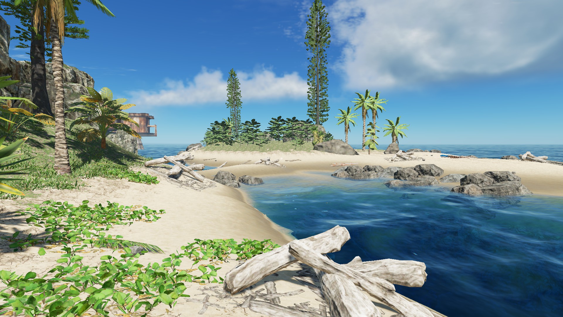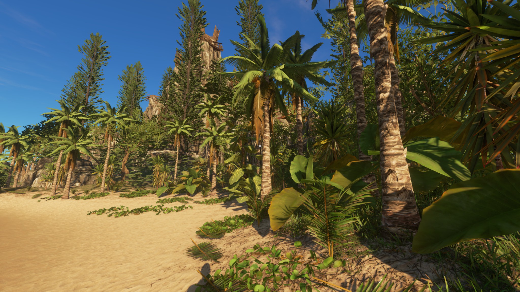 Auf Deutsch:"Ich denke, die Insel ist wirklich nett, wie es ist und ich habe nichts von der Vegetation oder Rock / Klippen entfernt." Die einzigen Dinge, die ich entfernt habe, waren die Stämme, Palmenwedel, Felsen, Stöcke und Bleche. Ein paar habe ich zurückgebracht als Start-Ressourcen, aber Spieler können mehr von der Vegitation und Bergbau Zeug bekommen. " Zitat Ende
