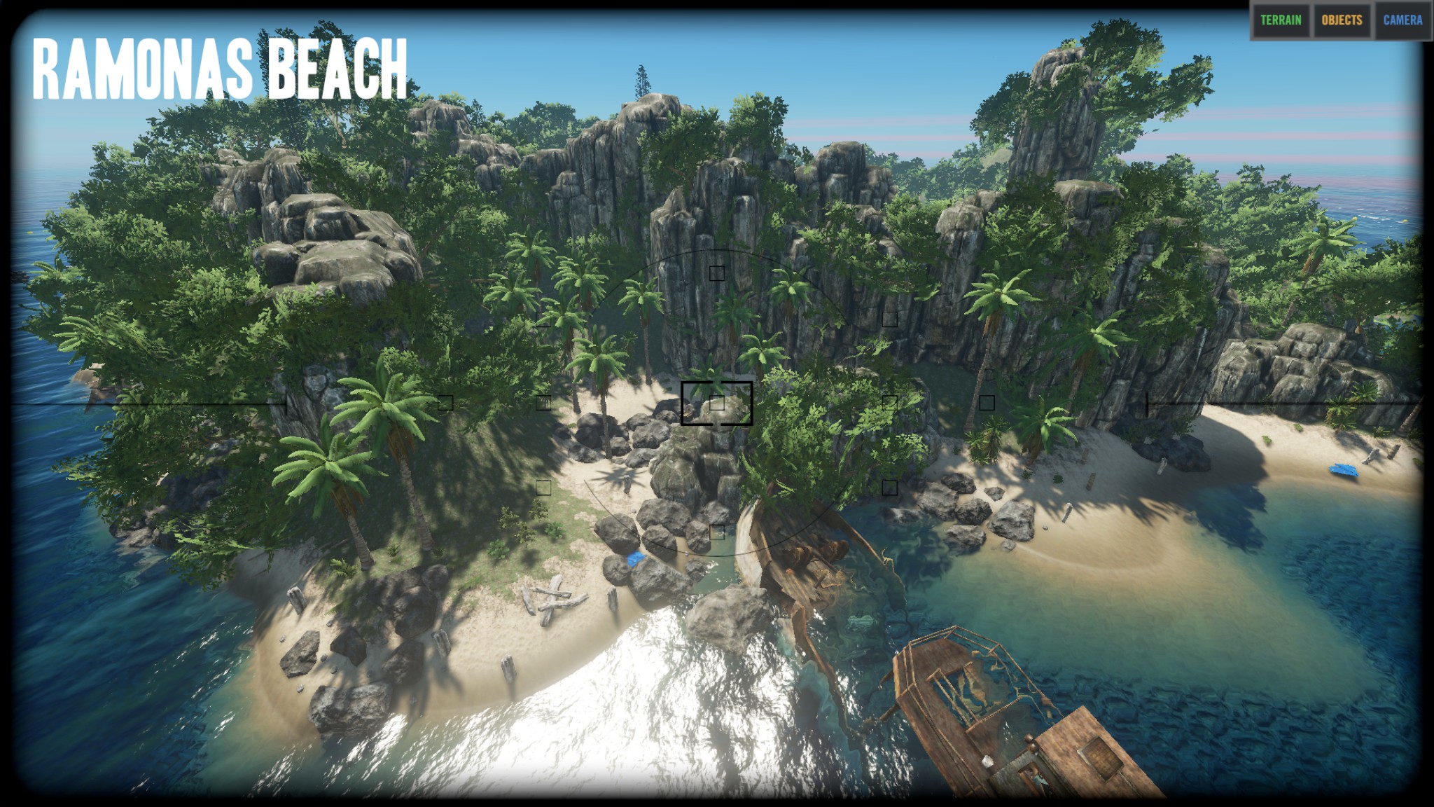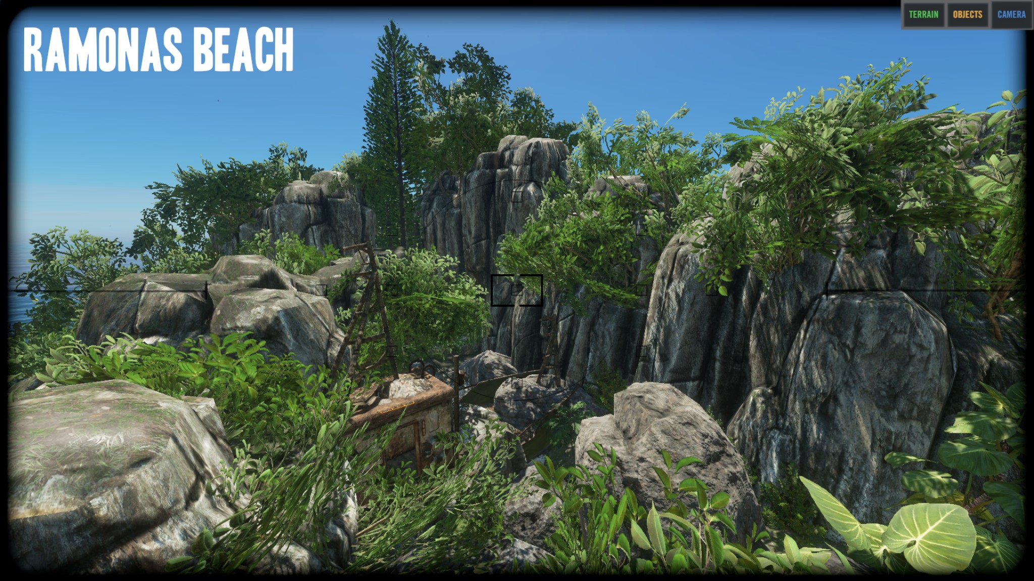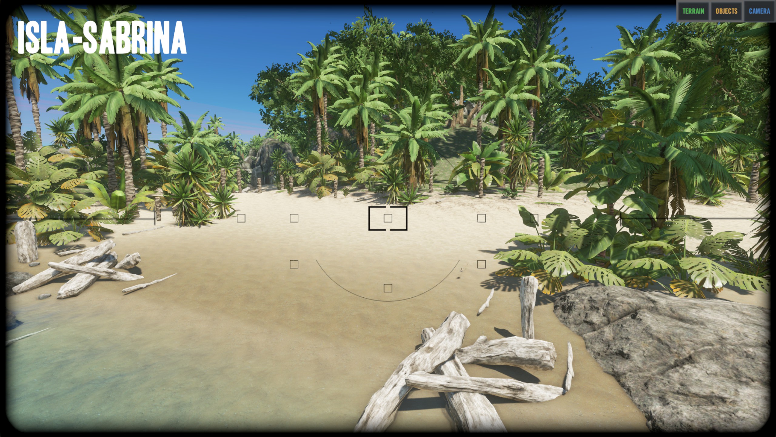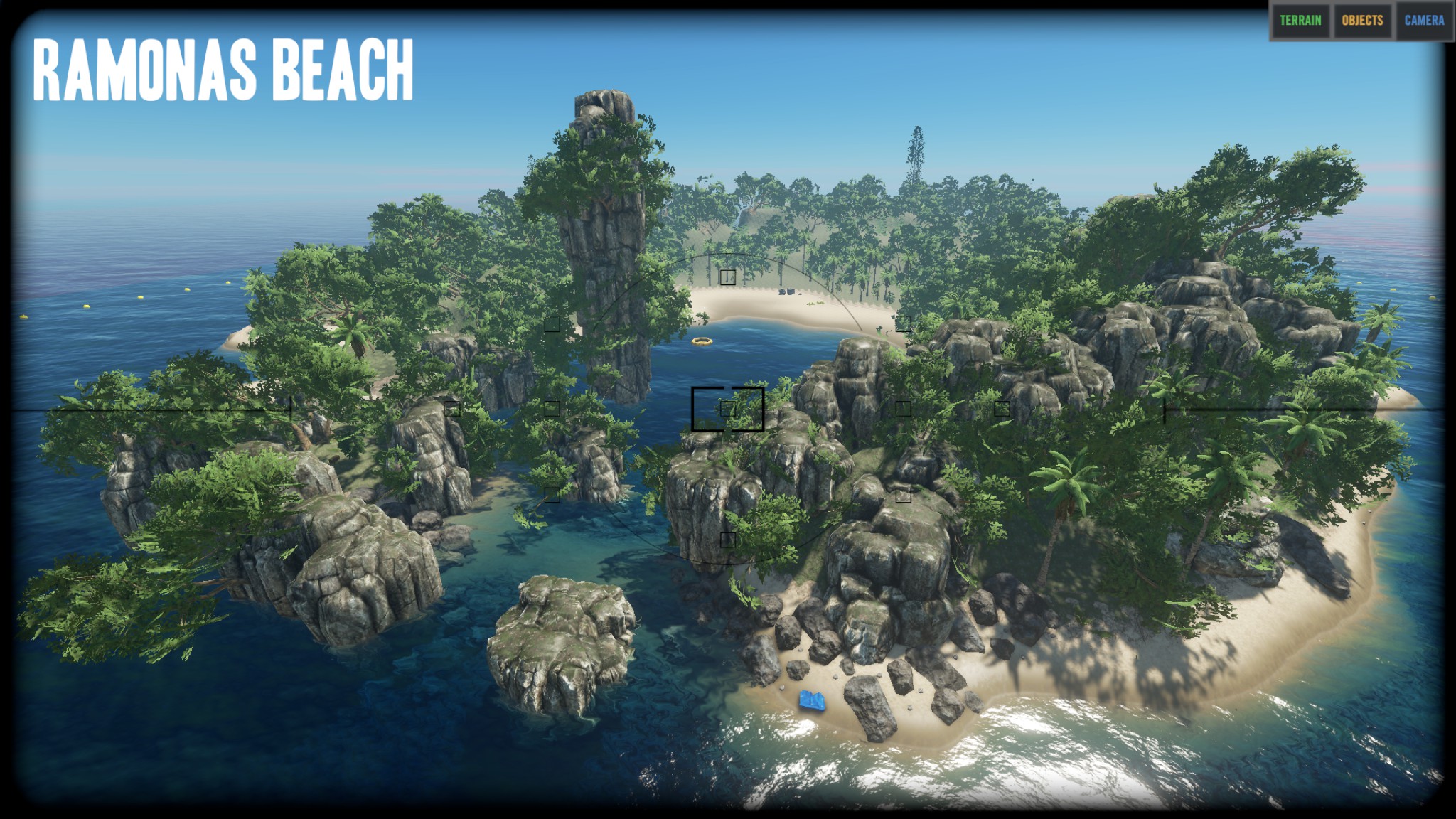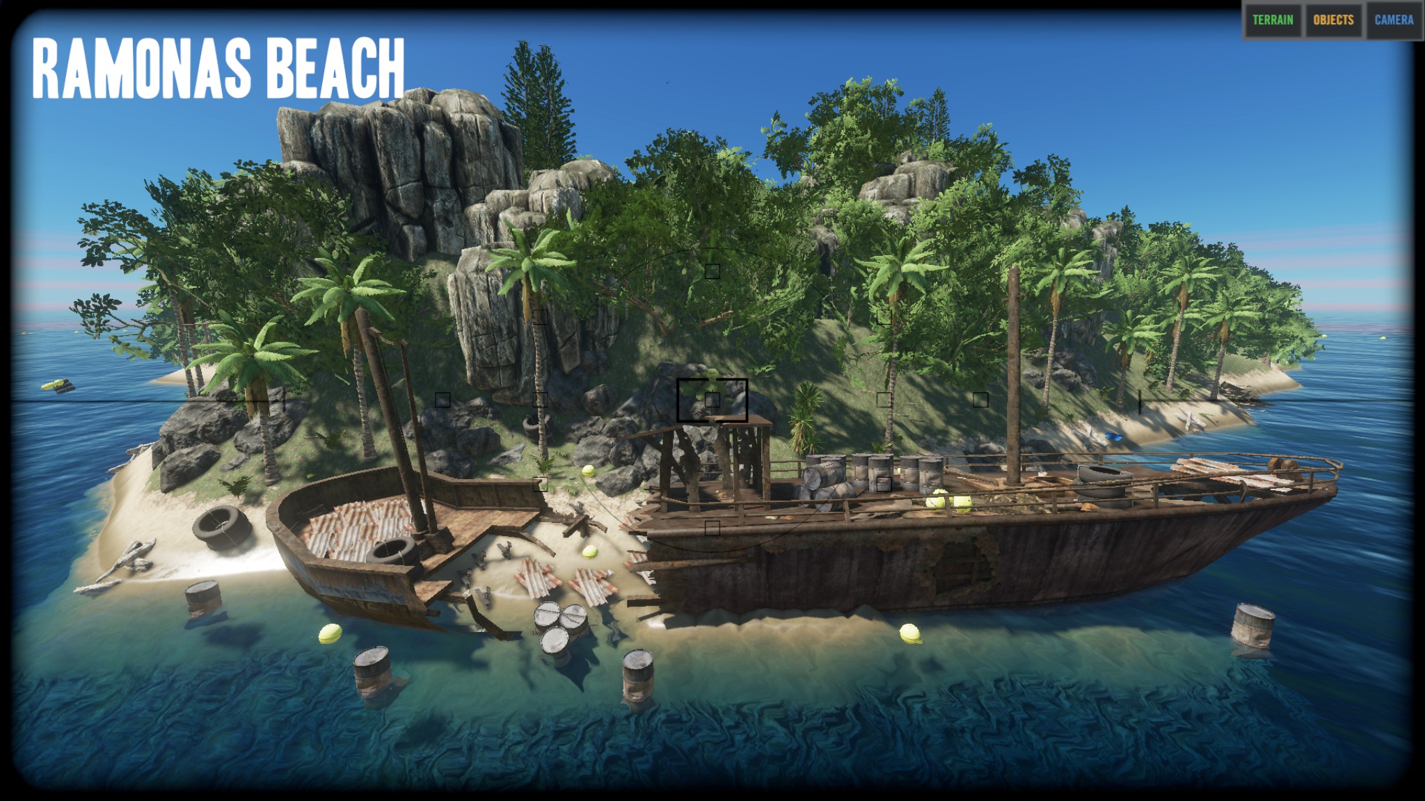 "I think the island is really nice the way it is and did not remove any of the vegitation or rock/cliffs. The only things that I removed were the logs, palm fronds, rocks, sticks, and scraps. I did put a few back on the island as start resources, but players can get more from the vegitation and mining stuff." Zitat Ende