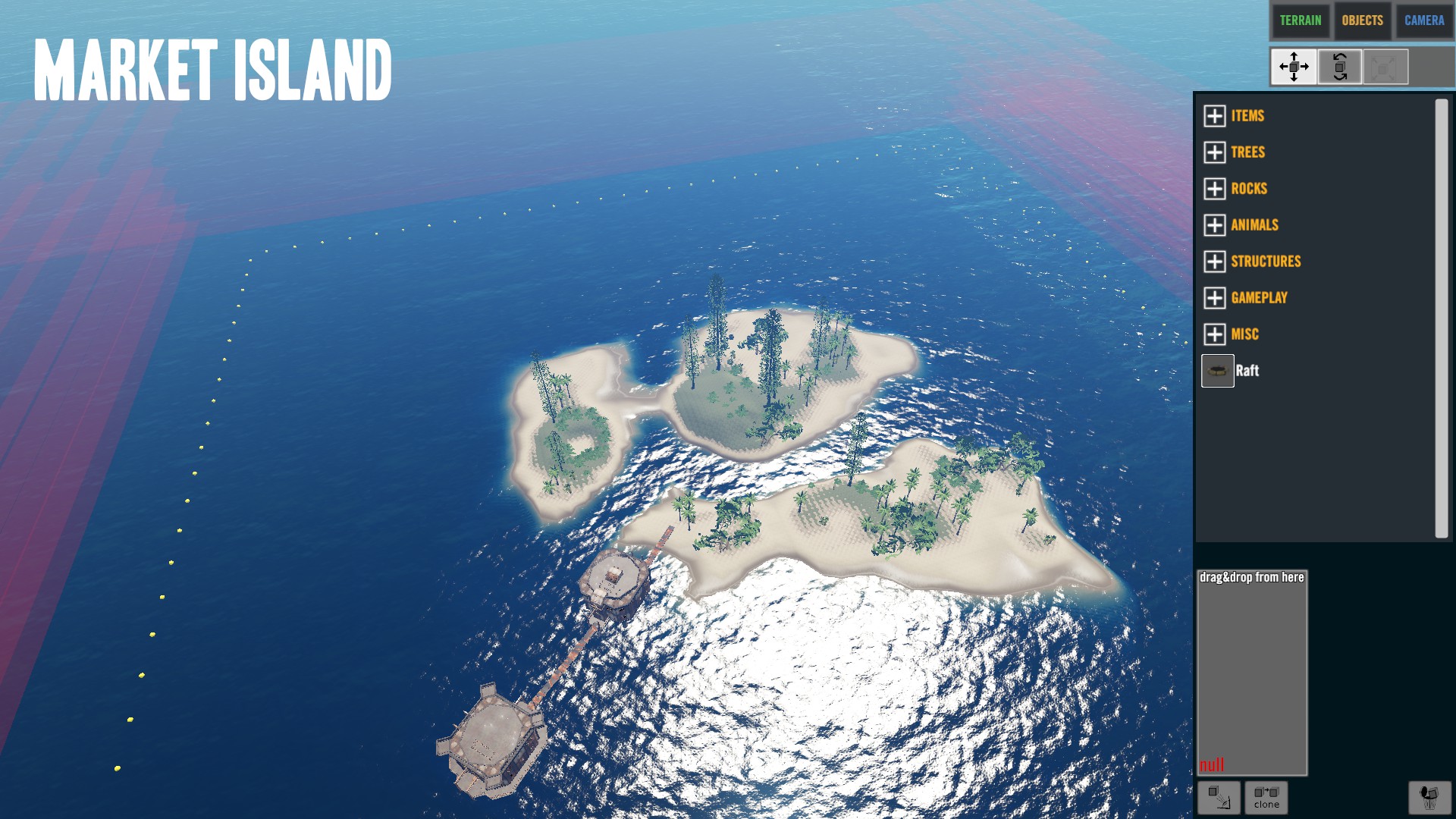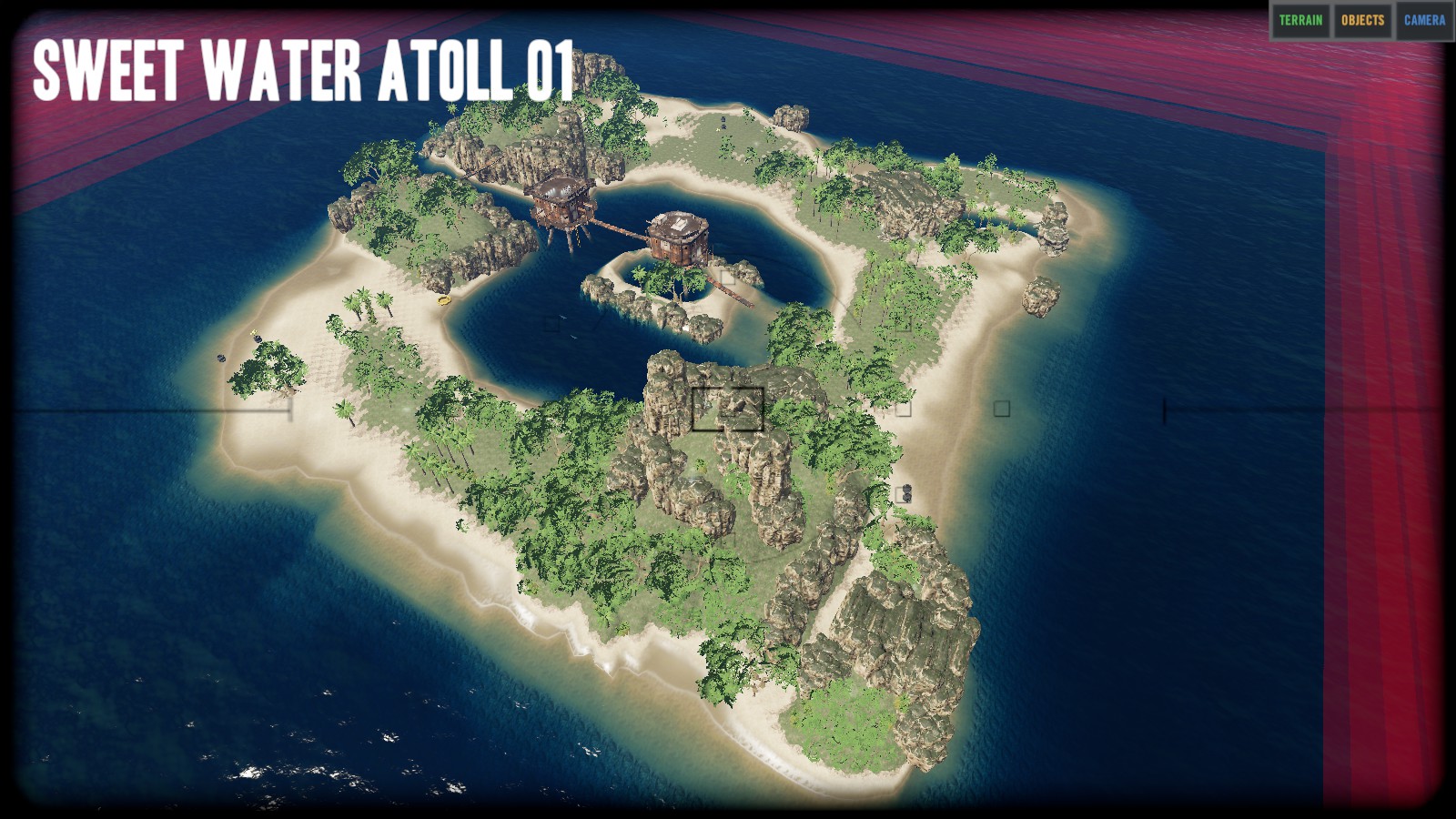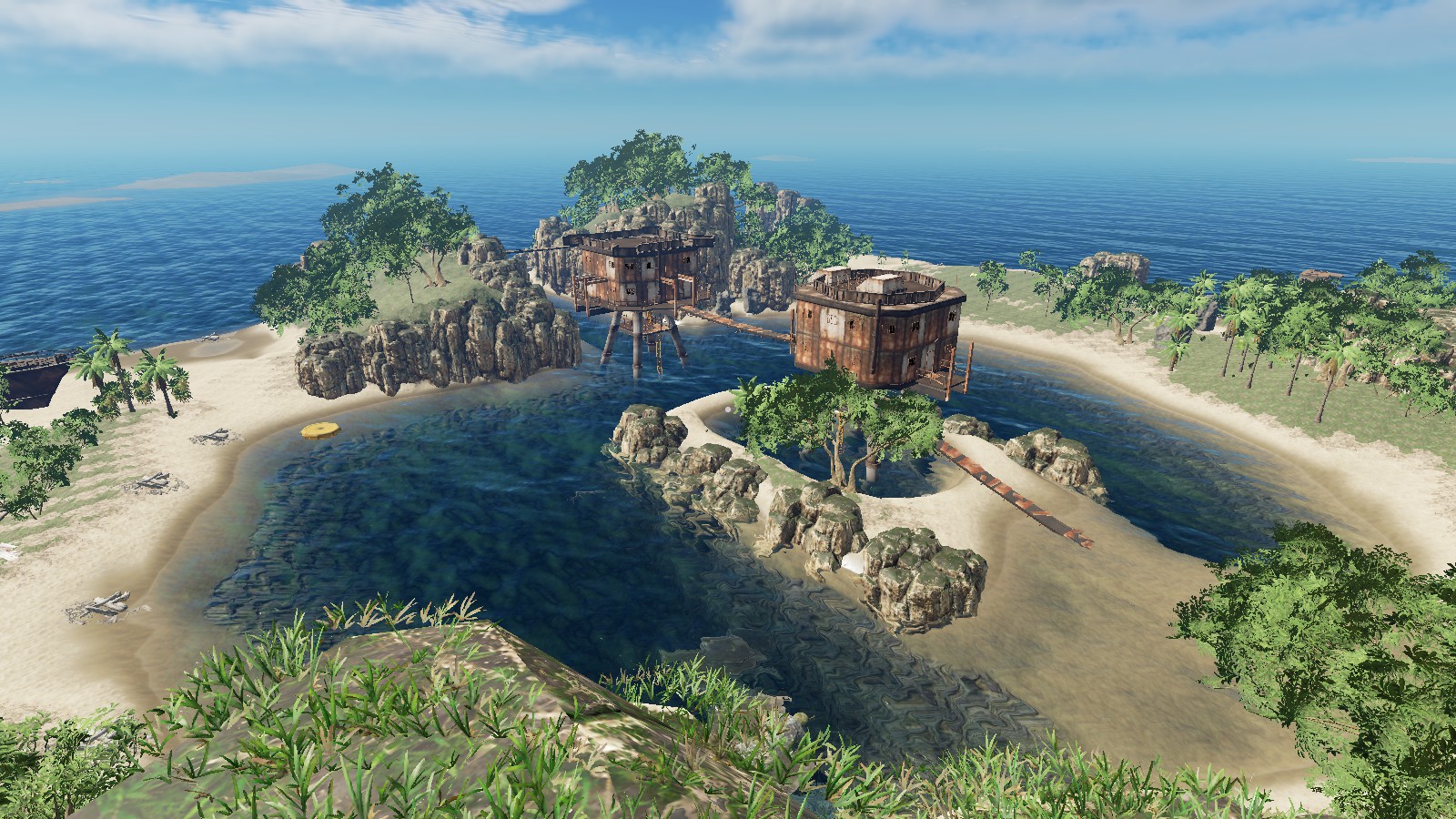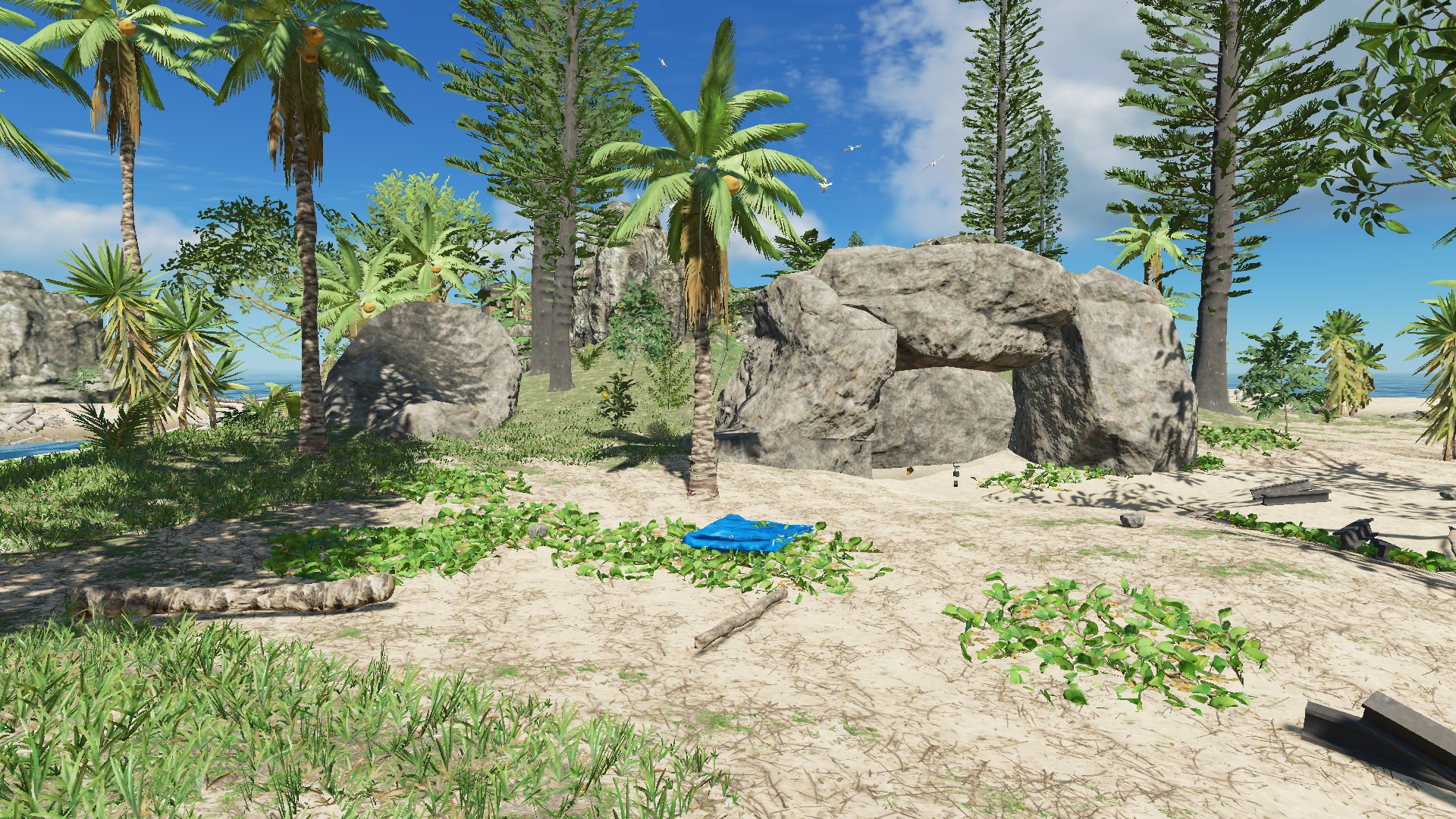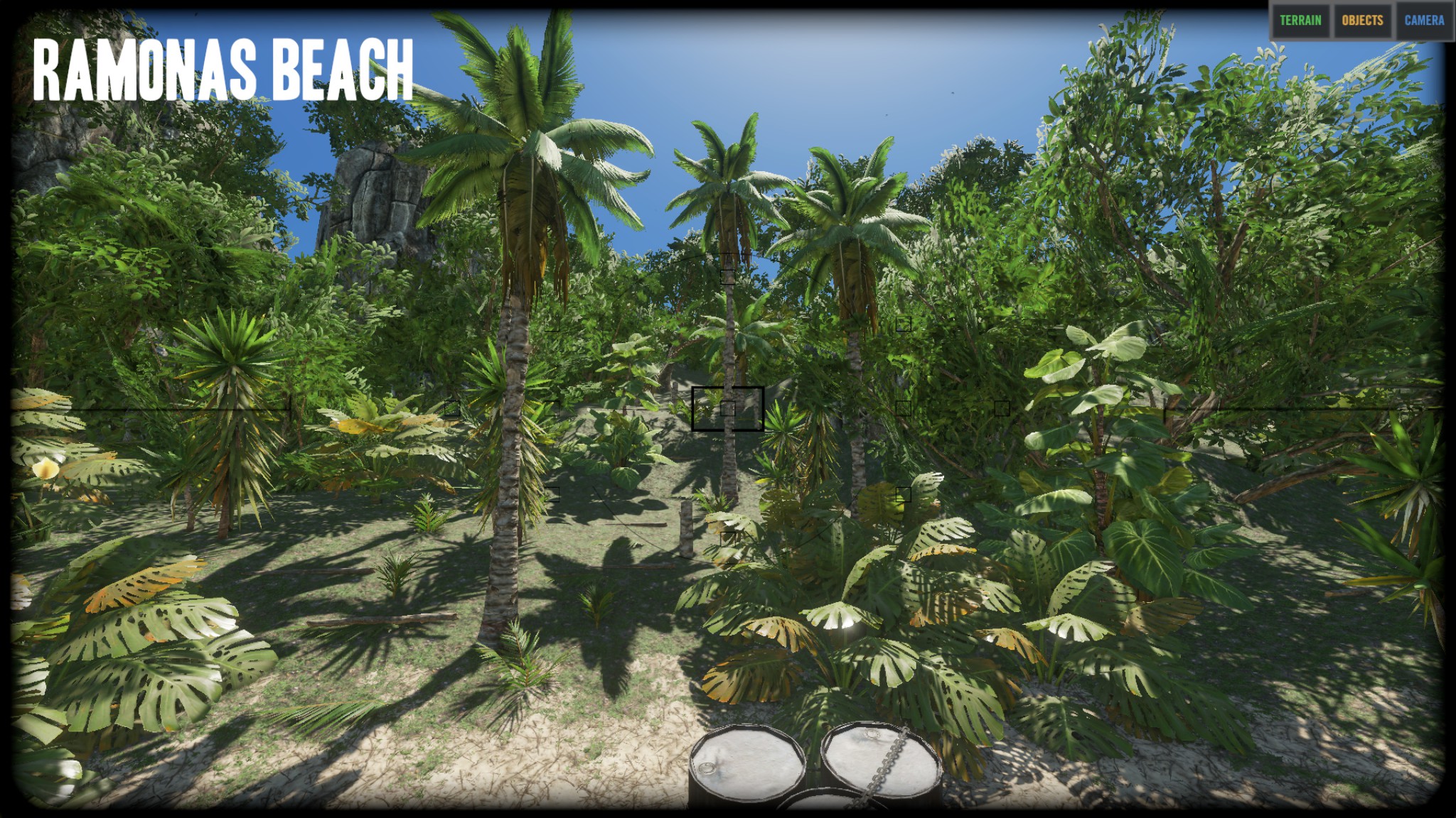 "I think the island is really nice the way it is and did not remove any of the vegitation or rock/cliffs. The only things that I removed were the logs, palm fronds, rocks, sticks, and scraps. I did put a few back on the island as start resources, but players can get more from the vegitation and mining stuff." Zitat Ende
