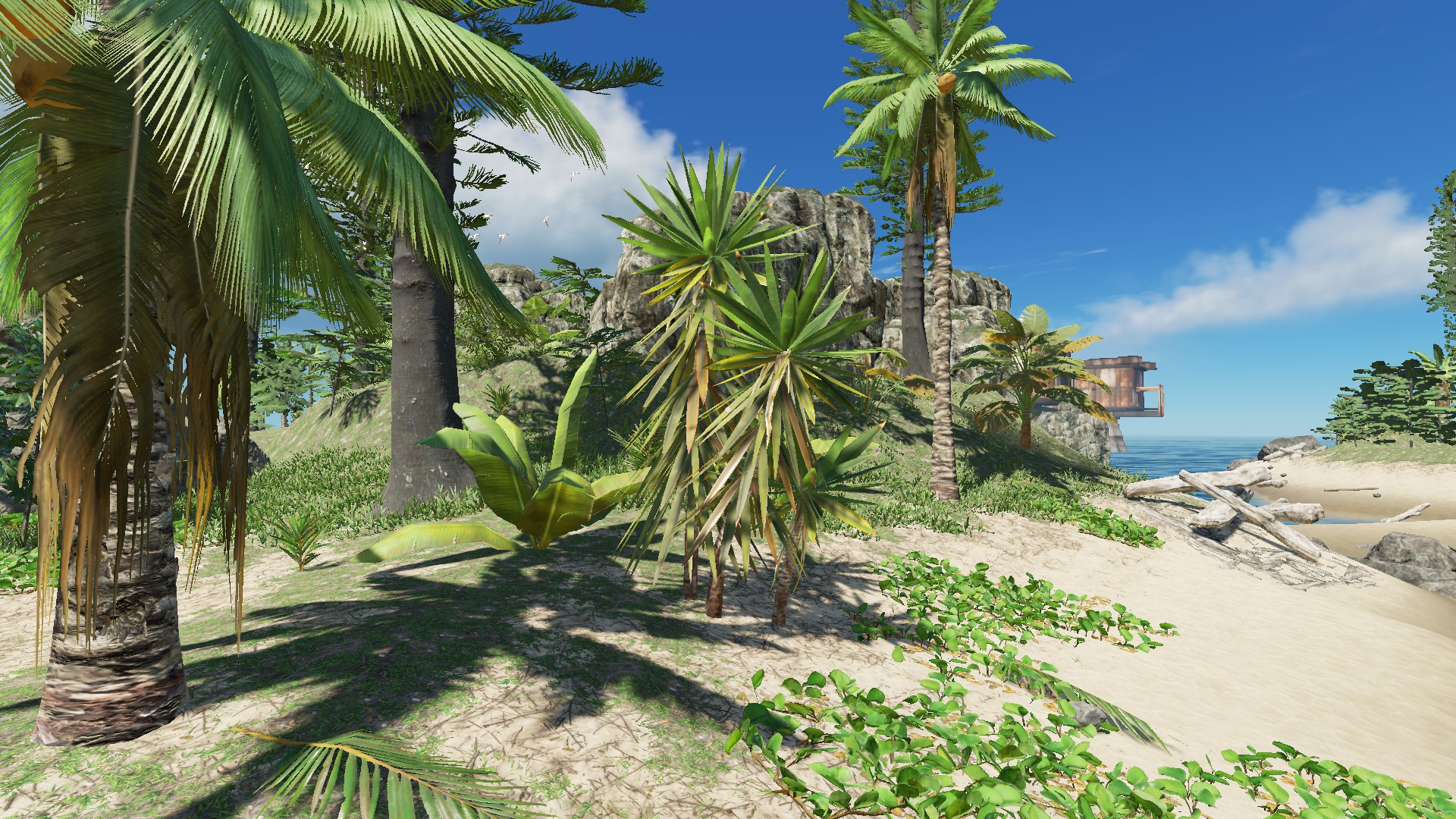 Diese Insel bietet Nahrung im Ueberfluss, Baumaterialien und Werkzeug genug, um nach Herzenlust zu bauen