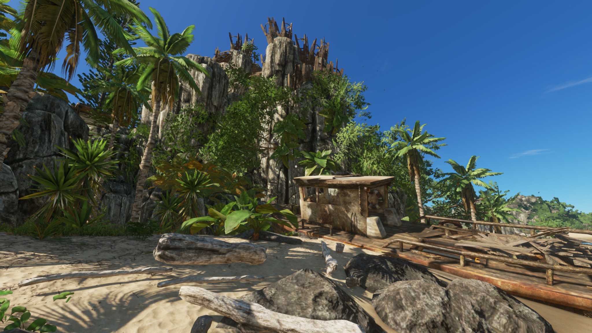 Dieses überladen ergab die lange Ladezeit, bis die Insel komplett im Spiel geladen ist und das "um die Ohren fliegen" gewisser Objekte beim stranden. Selbstverständlich haben diese Objekte auch die Bildrate (FPS) massiv heruntergedrückt. Ich hatte im Sturm immer nur 7 Bilder pro Sekunde. Man kann das Spiel zwar so spielen, aber ist irgendwie...Pffffhhh