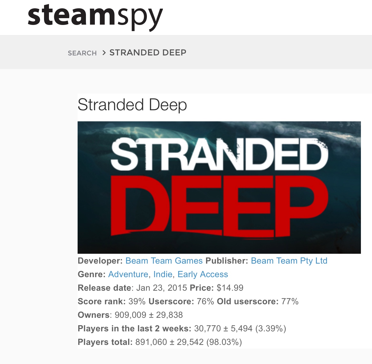 Stranded Deep Daten von SteamSpy!