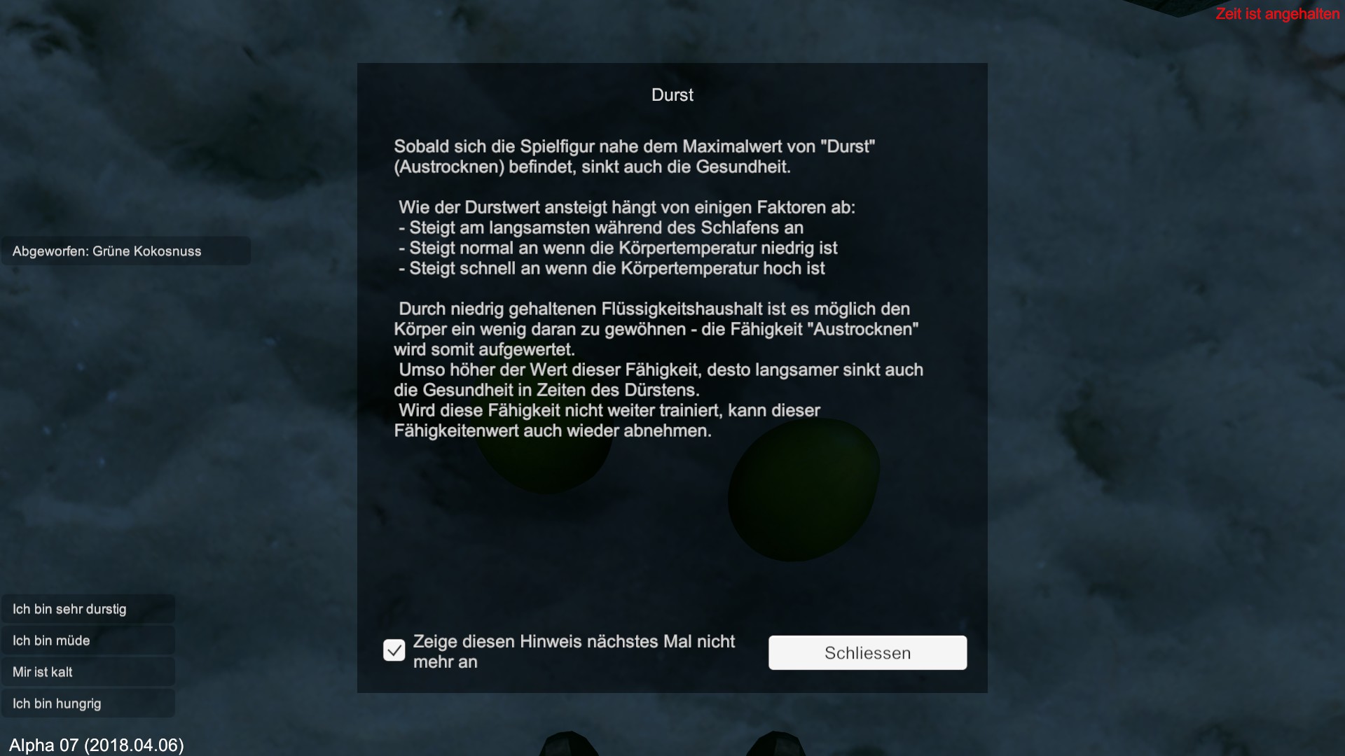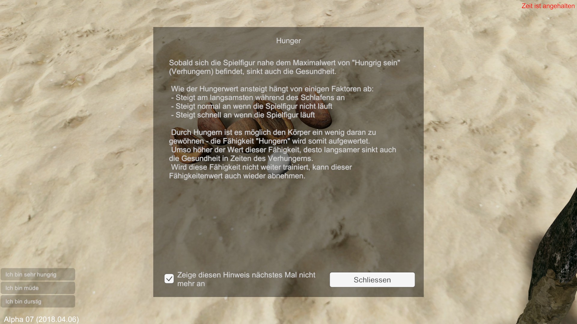 Eine Meldung über Durst und Hunger erfolgt erst, wenn der Wert über 50 steigt.