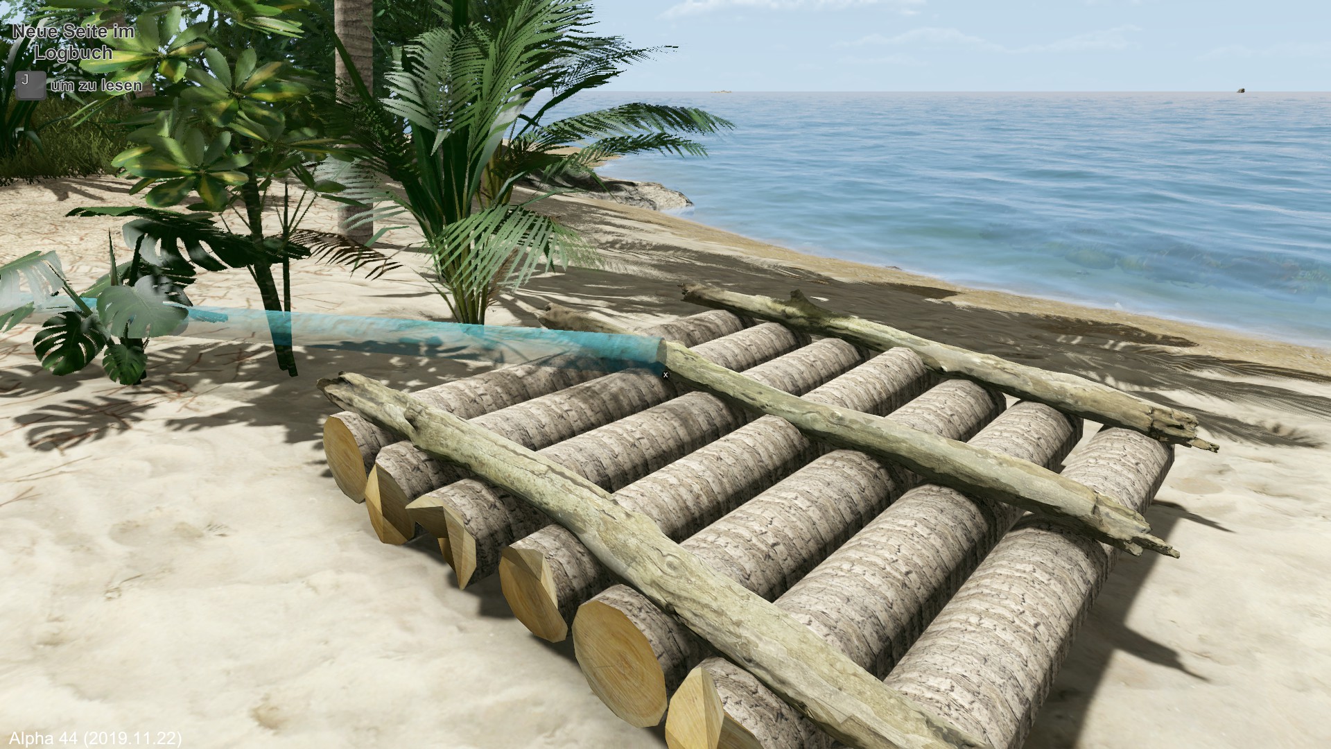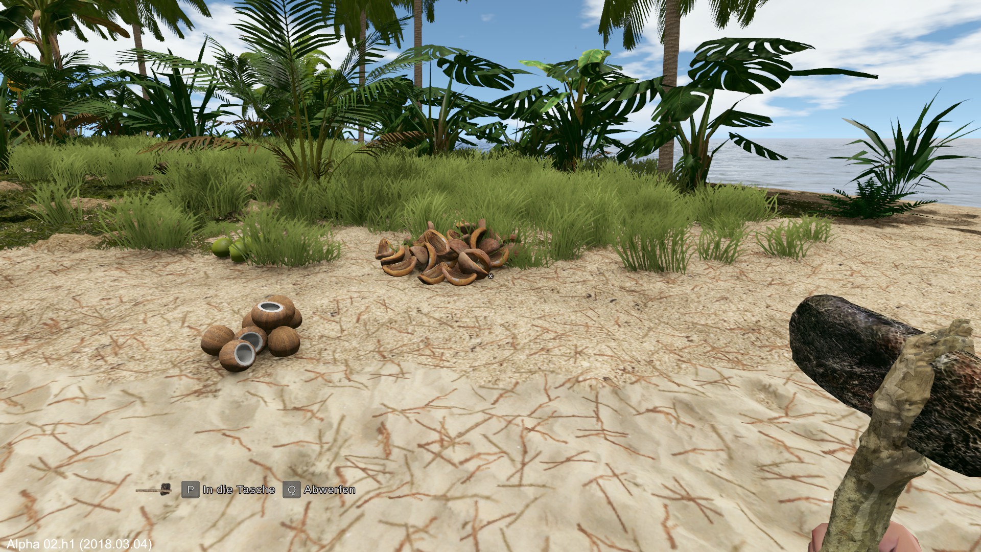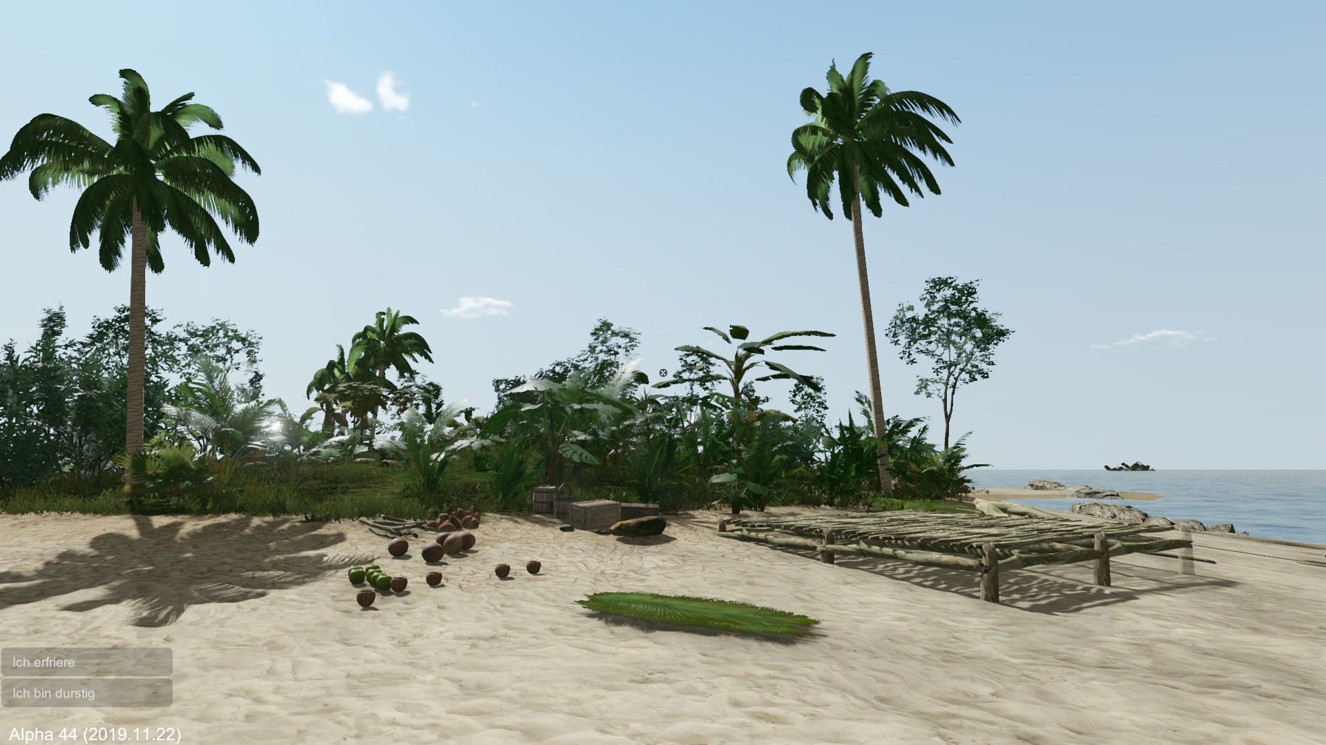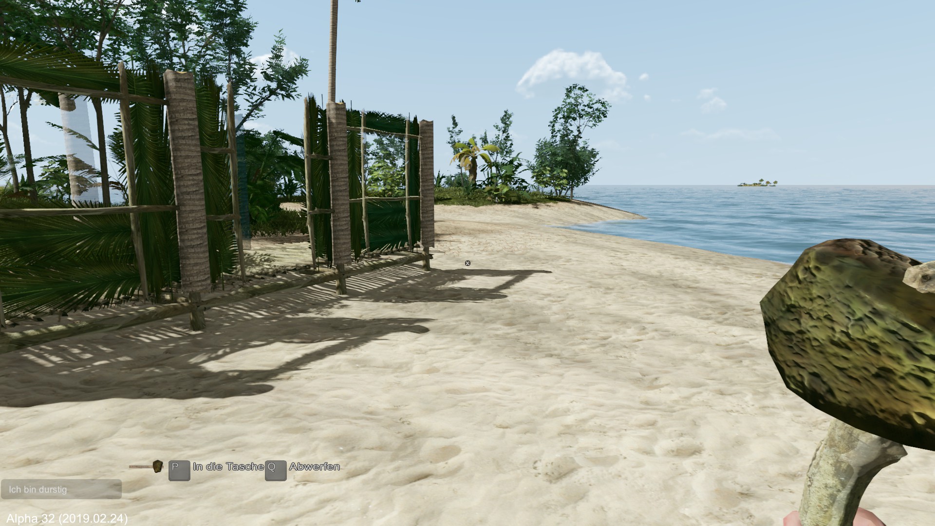Am nächsten Morgen fälle ich eine der wenigen Palmen und erhalte damit vorerst Flüssigkeit mit den Kokosnüssen. Das Holz wird zum Hüttenbau verwendet.
