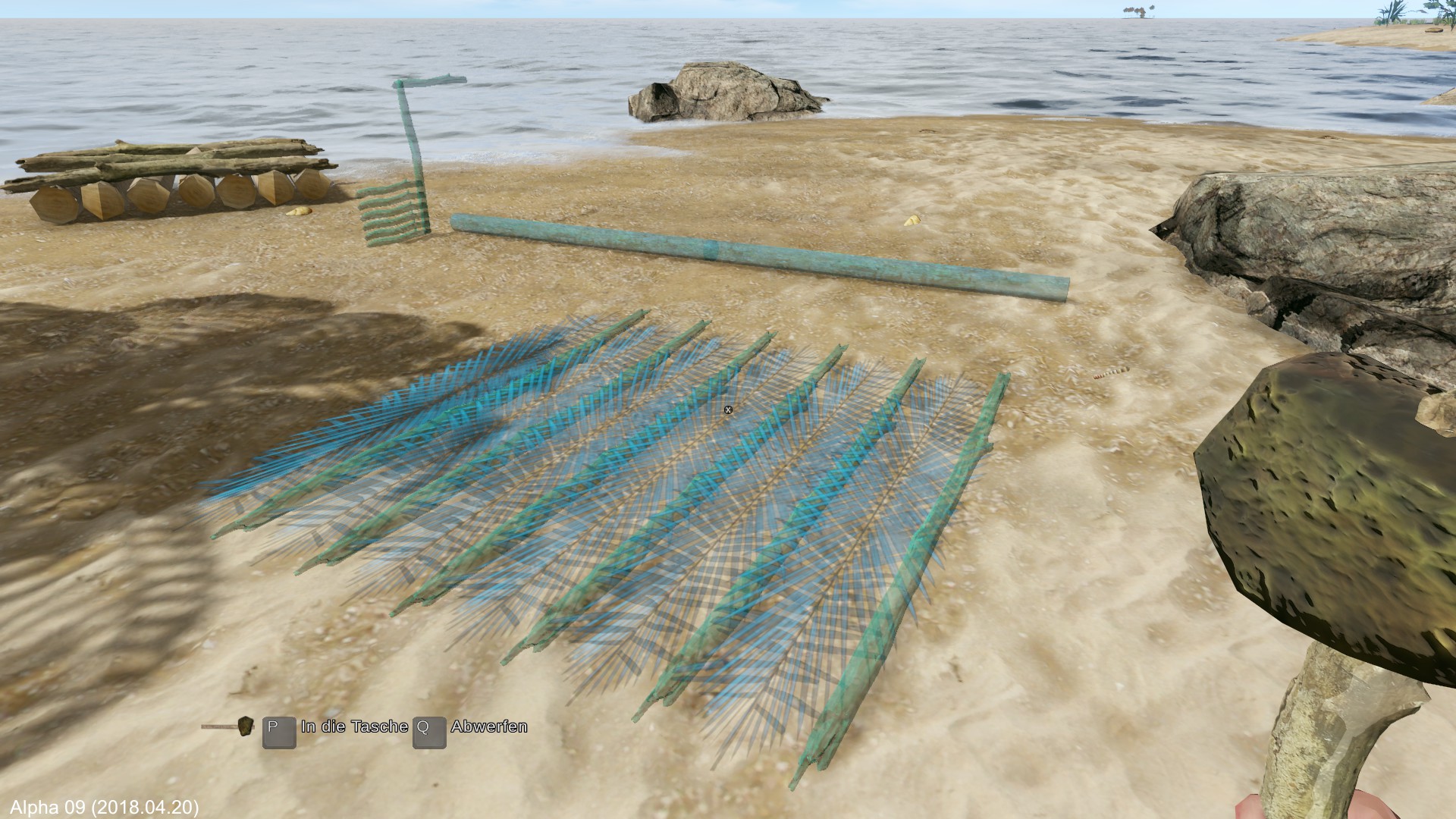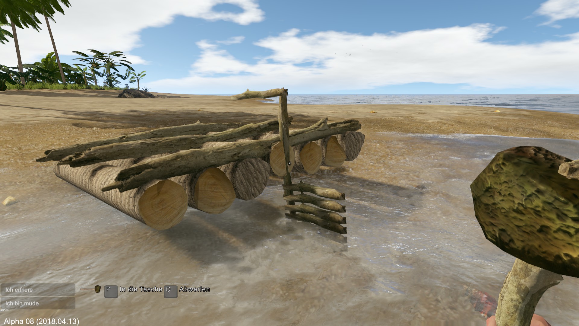 Problem: Ich bringe das Floß wieder zu Wasser und habe dummerweise das Segel oben gelassen.