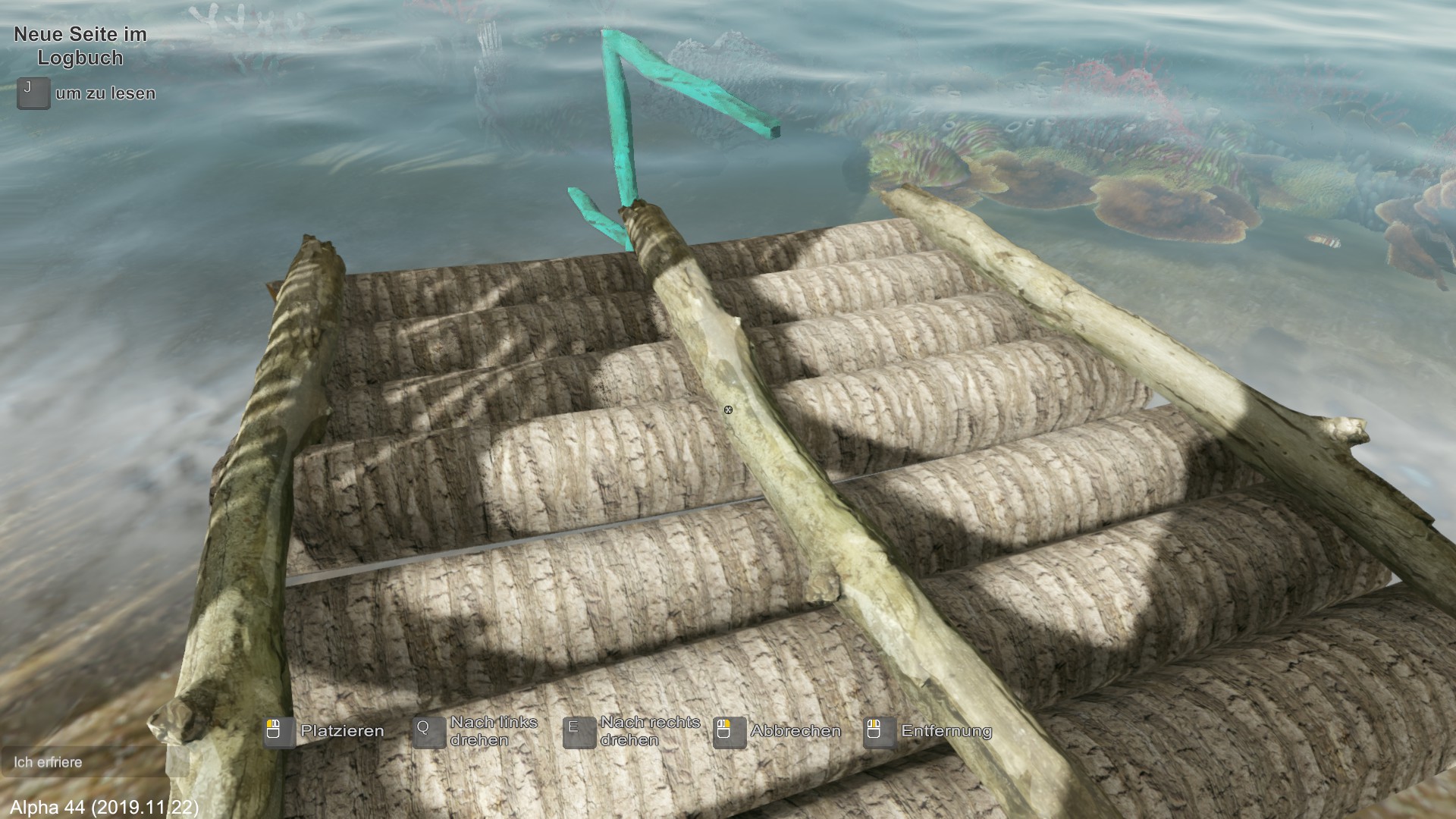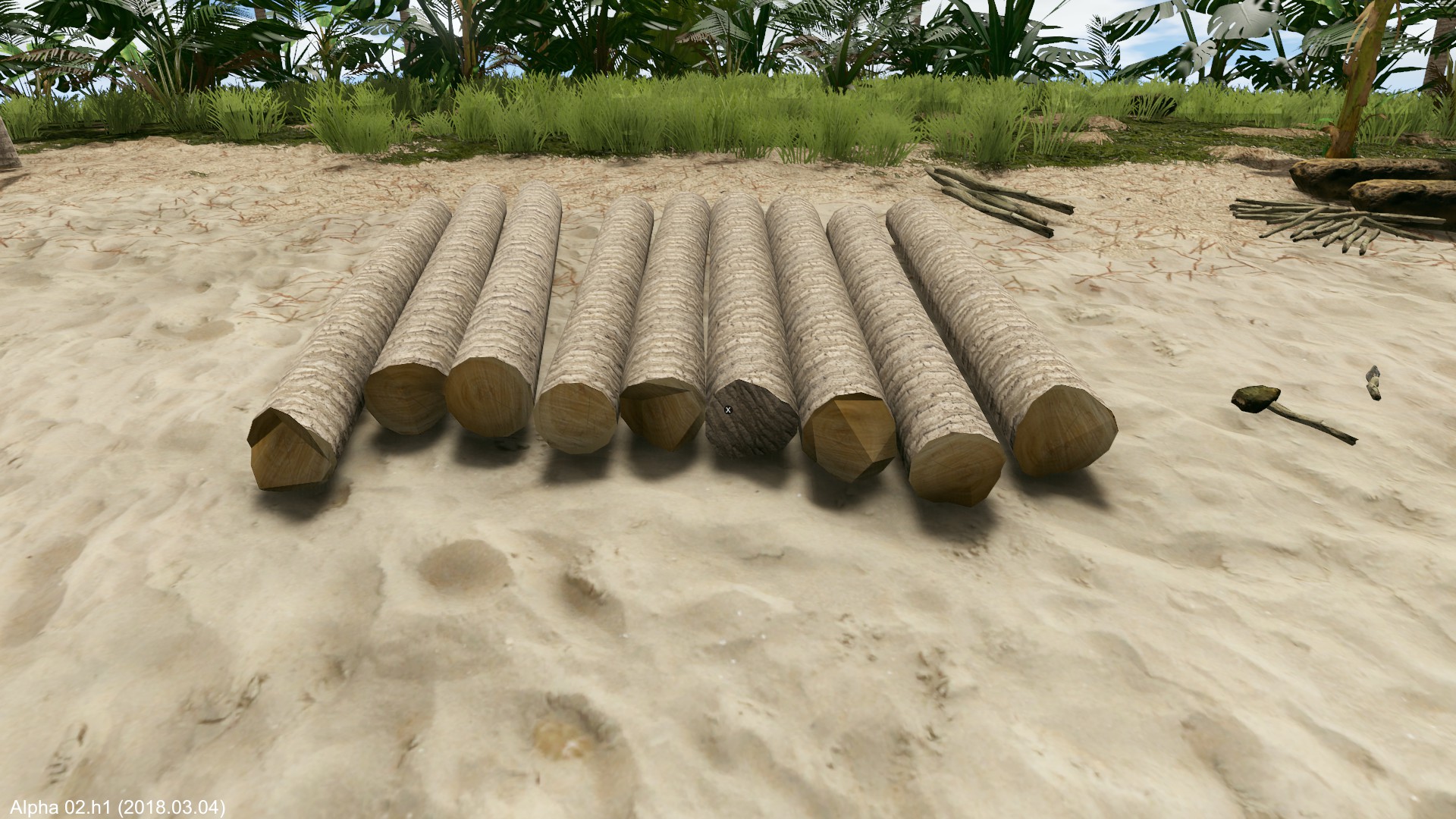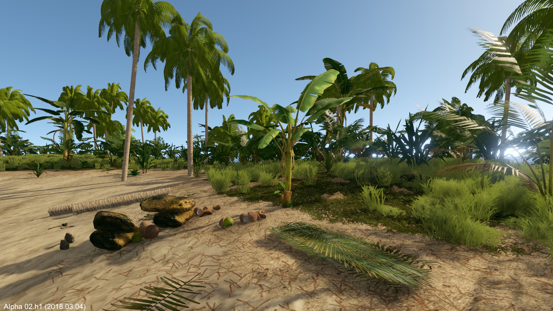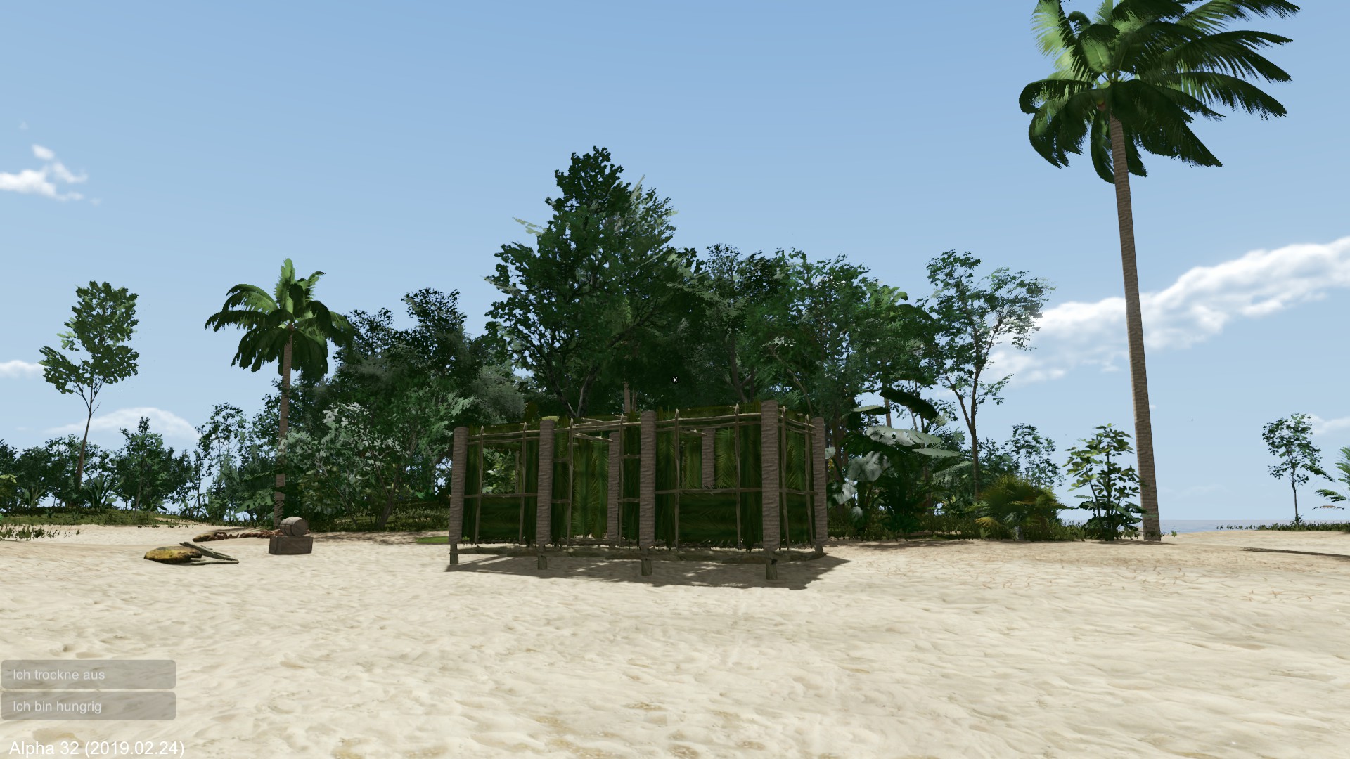 Am nächsten Morgen fälle ich eine der wenigen Palmen und erhalte damit vorerst Flüssigkeit mit den Kokosnüssen. Das Holz wird zum Hüttenbau verwendet.