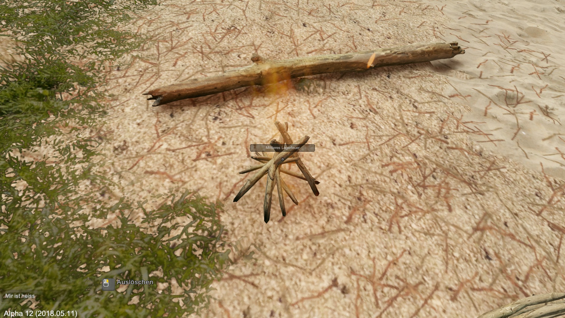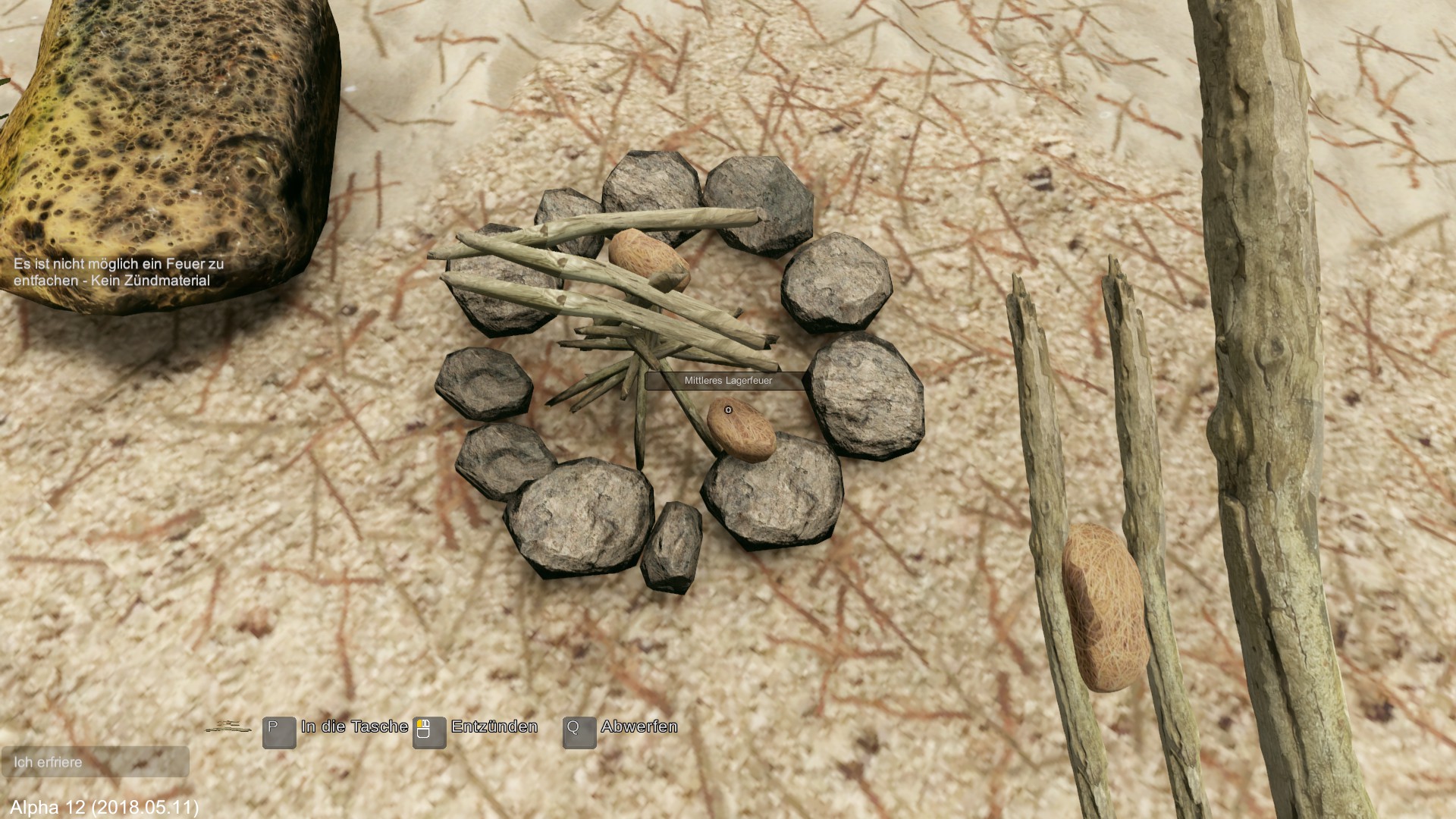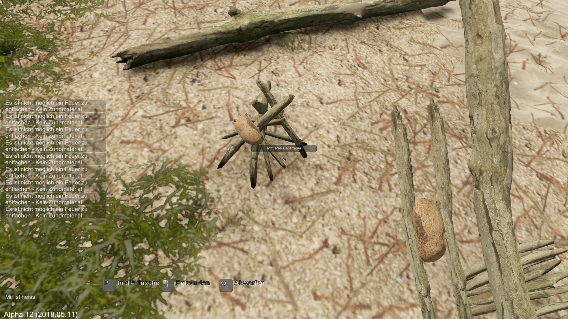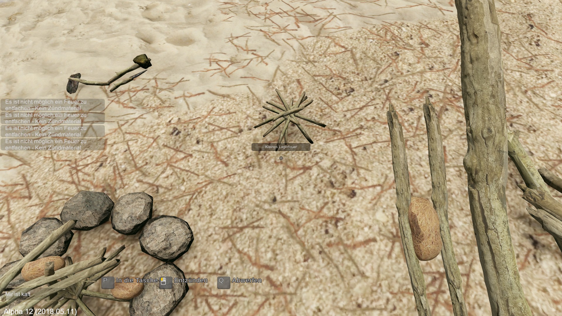 Wie im Bild zu sehen, ist eine mittlere Feuerstelle erstellt. Leider lässt sich das Feuer nicht entzünden, obwohl Feuerholz und Kokosnussfasern als Zündmaterial vorhanden sind. Meldung kein Zündmaterial vorhanden.