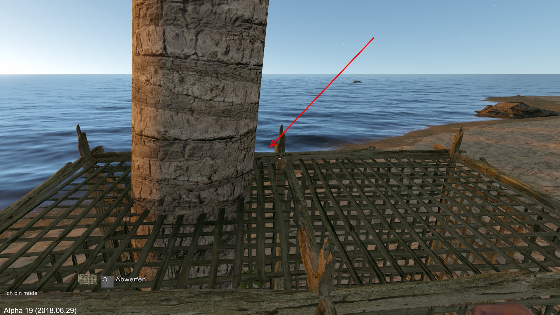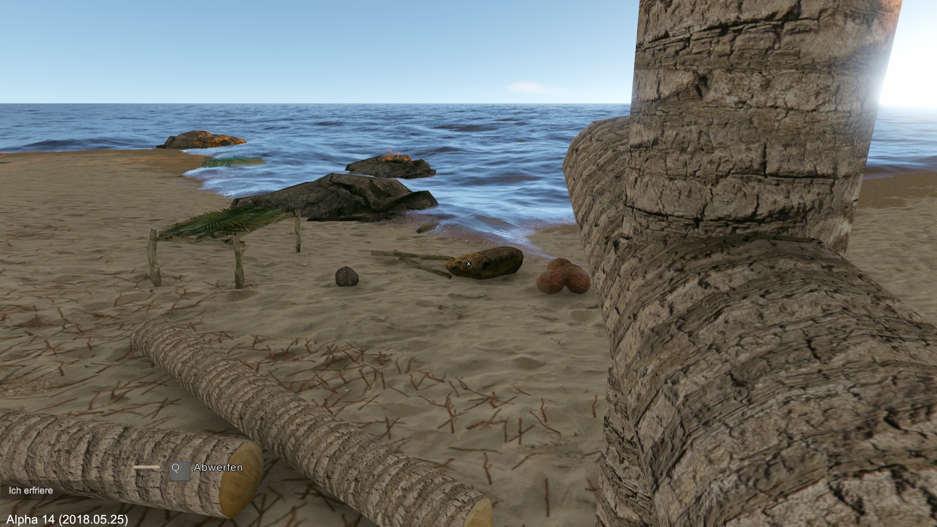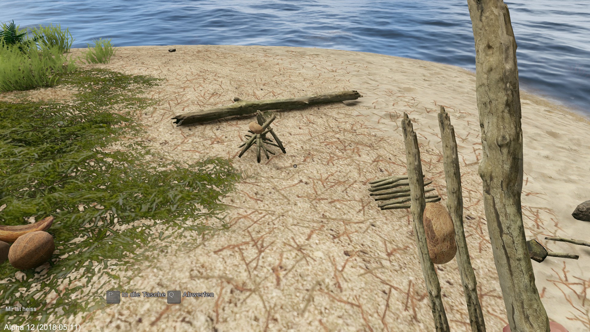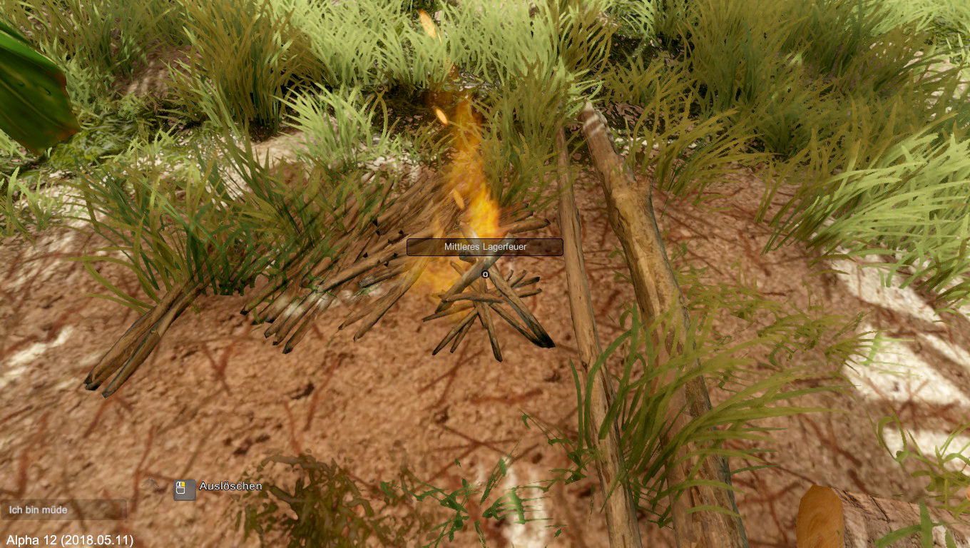 Wie im Bild zu sehen, ist eine mittlere Feuerstelle erstellt. Leider lässt sich das Feuer nicht entzünden, obwohl Feuerholz und Kokosnussfasern als Zündmaterial vorhanden sind. Meldung kein Zündmaterial vorhanden.