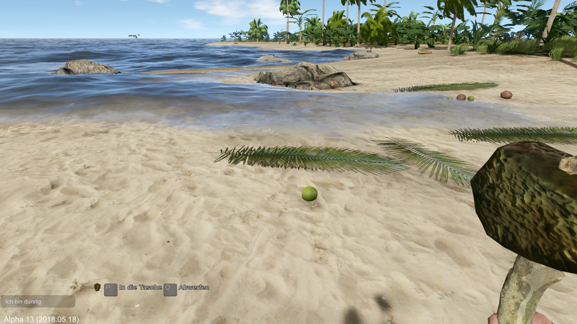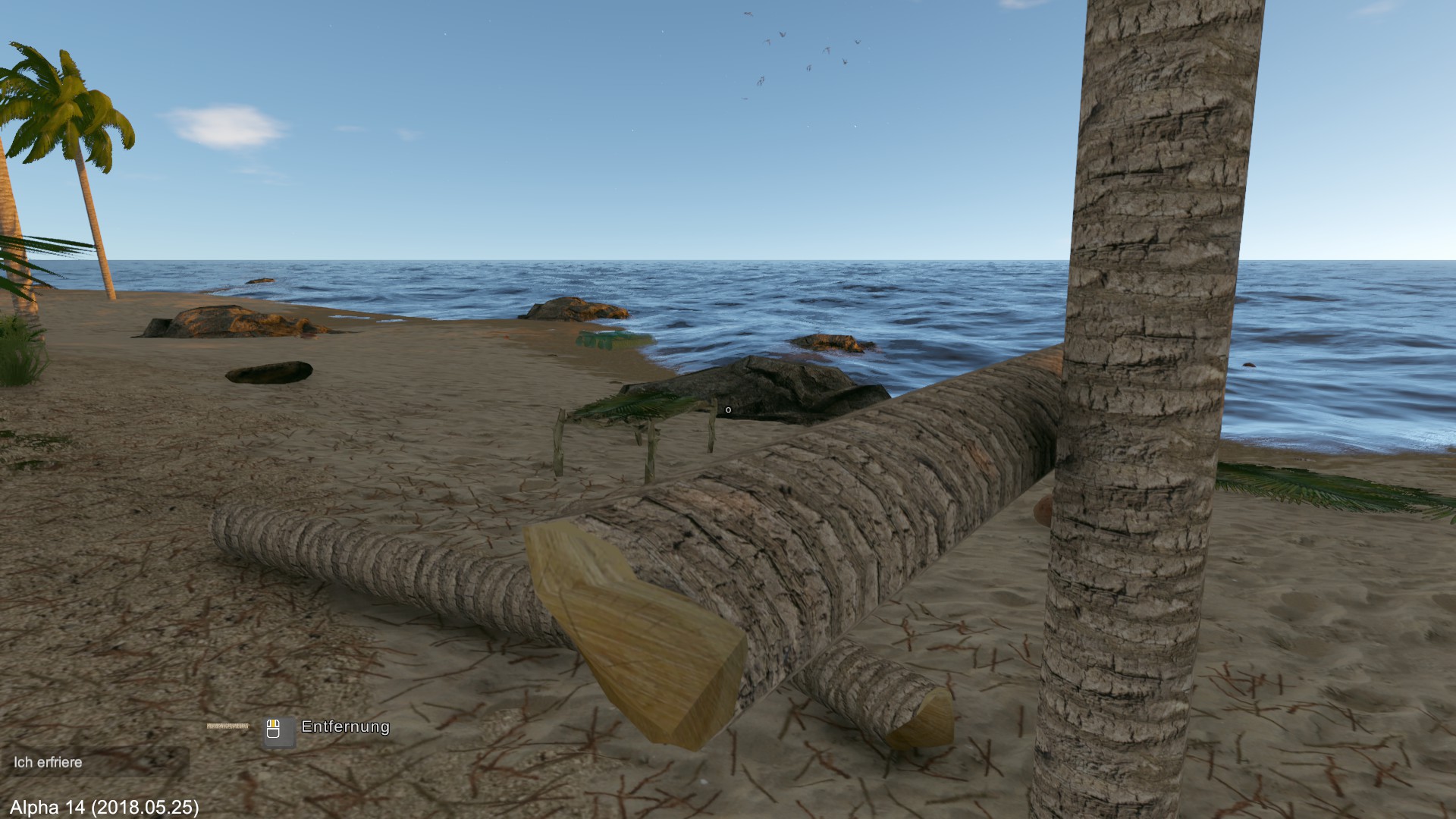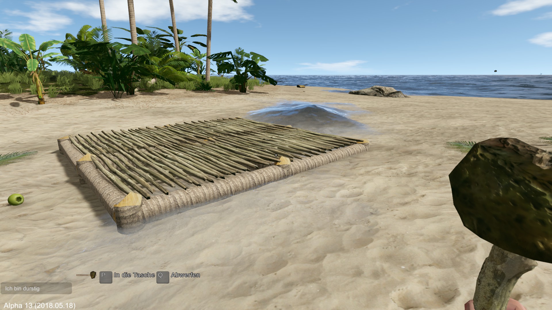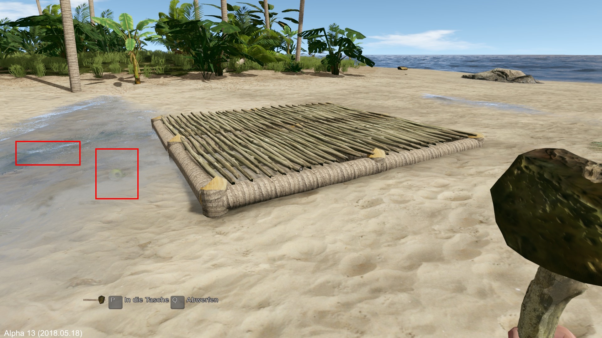 Wie im Bild zu sehen, ist eine mittlere Feuerstelle erstellt. Leider lässt sich das Feuer nicht entzünden, obwohl Feuerholz und Kokosnussfasern als Zündmaterial vorhanden sind. Meldung kein Zündmaterial vorhanden.